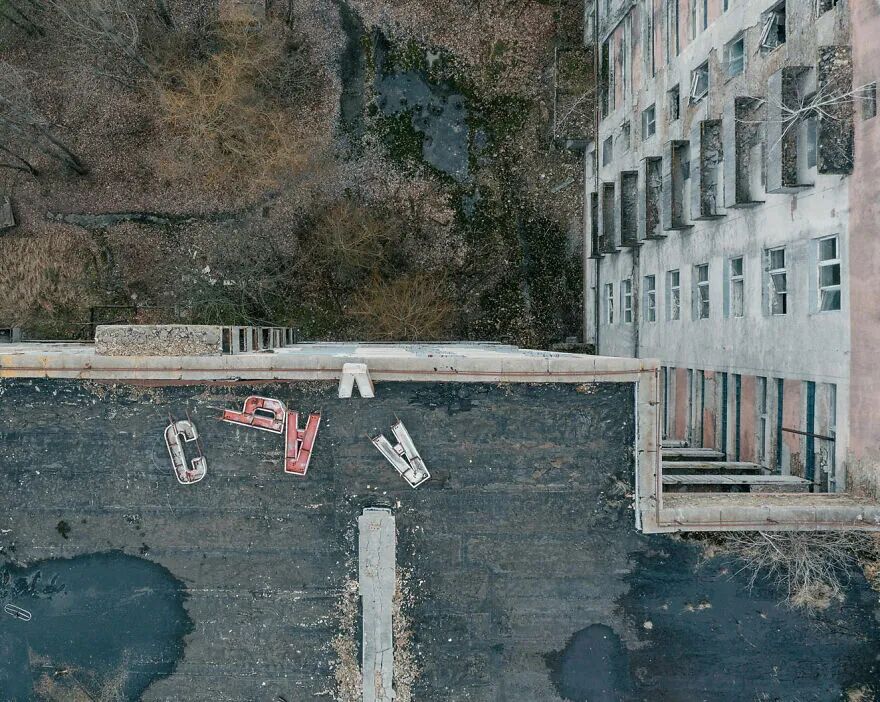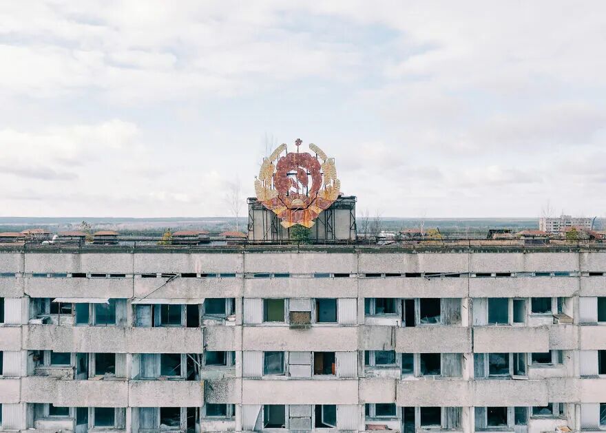 普里皮亚季(Pripyat)主广场上有两座相同的高层建筑,锤子和镰刀仍然刻在这两个废墟上。