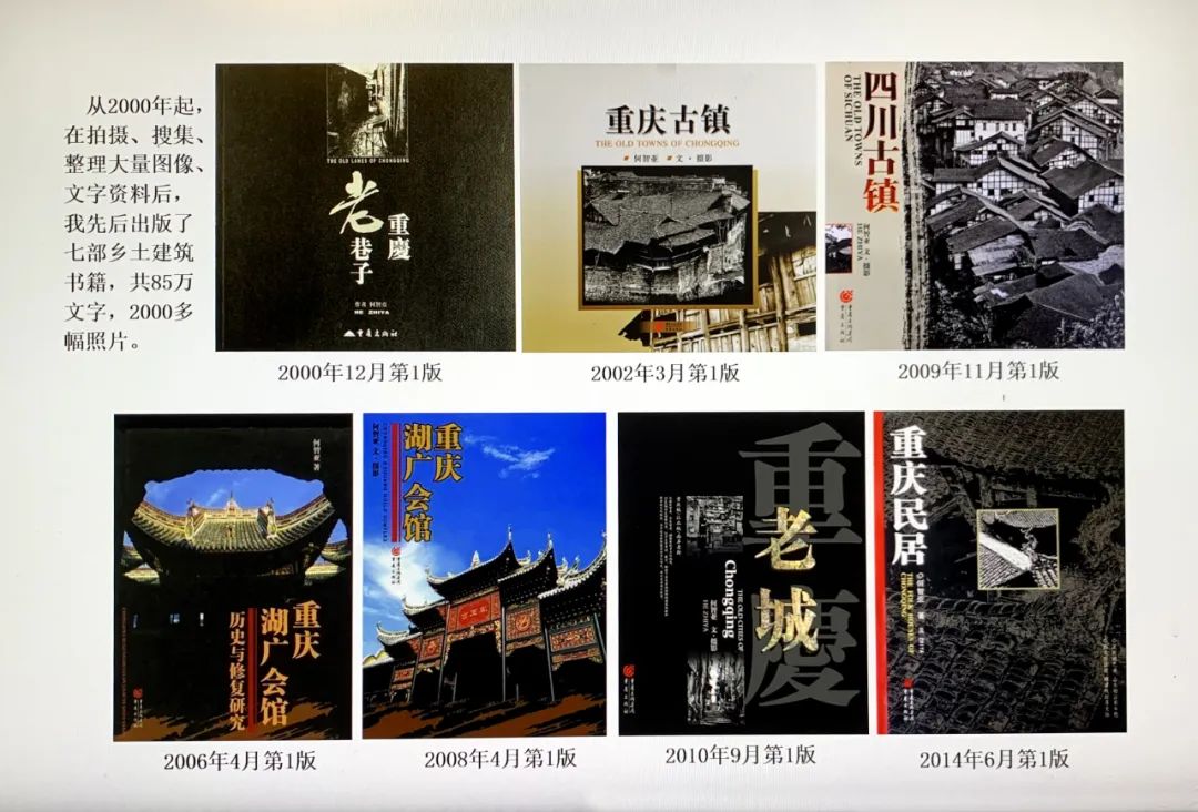 我的城市影像记录从老巷子,到古镇,到重庆老城,再到重庆民居,积累了丰富的资料。结合多年拍摄的照片资料,我开始收集、考证、查找大量历史资料,从2000年至今,我先后出版了9部著作,7本是自己写作的关于重庆本土历史和建筑著作,两本是主编的著作。