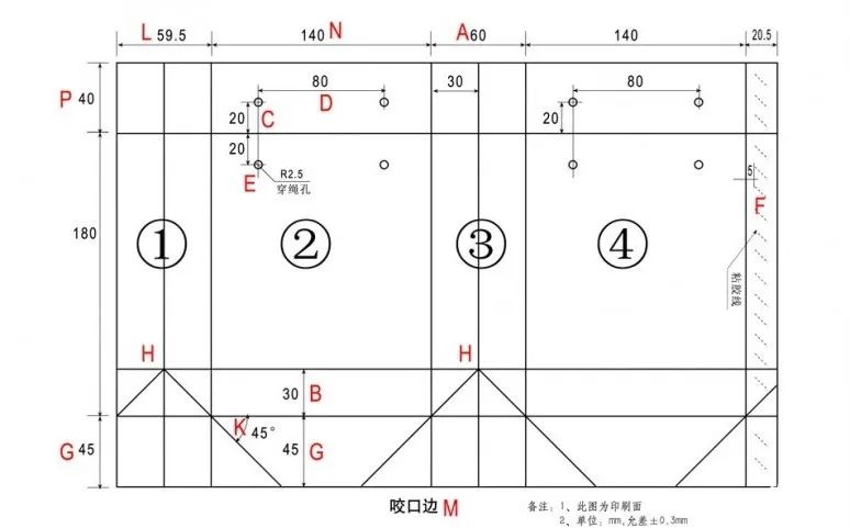 1、①②③④四个面是我们首先要确定尺寸的,一般来讲①面的宽度L比③面的宽度A要小0.5-1mm,是为了粘手提袋后便于内折,同时粘贴面处内缩,可防止边缘靠近折痕而粘贴不紧。