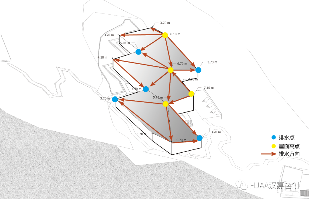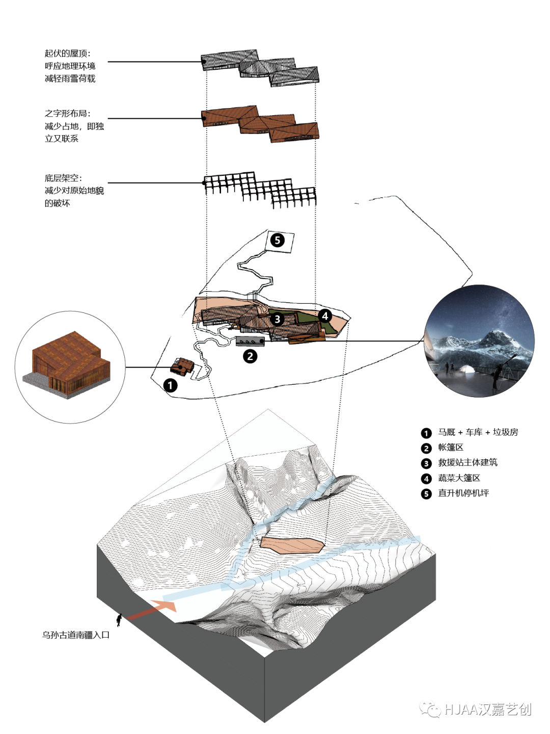 最新文章2024-01-05 HJAA 新作 | 新疆乌孙古道救援站 依山就势,保障救援亦保护生态。 原创|HJAA汉嘉艺创 作者|HJAA汉嘉艺创 编辑|Z 项目概况 本项目位于位于新疆阿克苏地区拜城县乌孙古道内,地块整体为山地坡地。主要作用是保障的乌孙古道的救援工作,并提升消防战士野外救援能力。 △ 救援站效果图 ©HJAA 地理环境 ——天山是世界七大山系之一,全长约2500公里,南北平均宽250—350公里,是世界上最大的独立纬向山系,也是世界上距离海洋最远的山系和全球干旱地区最大的山系。2013年,“新疆天山”列入世界遗产名录。 ——天山遗存着四千年前月氏、乌孙等早期游牧民族活动的遗迹,后来随着中国与中亚之间的交流日渐繁盛,古老的游牧文化和农商文化在这里不断地交流、融合,成为了天山人文历史发展的主旋律。 △ 分析图 ©HJAA ——这条乌孙古道位于天山中脉那拉提山,南北连接阿克苏拜城县和伊犁特克斯县,全长约120公里。 △ 乌孙古道 (图片来源网络) ——阿克布拉克达坂和包扎墩达坂位于天堂湖南北两侧。其中,阿克布拉克3900米、包扎墩3660米。达坂穿越艰险,但广阔的雪山胜景却壮阔非凡。 △ 天堂湖(图片来源网络) △ 分析图 ©HJAA △ 分析图 ©HJAA 设计理念 设计本着依山就势、减少生态破坏的设计理念,从建筑总体布局、建筑造型、竖向设计上均以此为基础展开设计。如山峰般绵延起伏的屋顶,是本项目最显著的特征。这样的设计既呼应了建筑所处的地理环境,也利于减轻屋面的雨雪荷载。被屋顶覆盖的相互错动的成“之”字形的三个建筑体量,即相互独立又相互连接,即是对局促的用地条件的回应,也是为了满足救援站同时作为游客补给站的功能需求。 △ 分析图 ©HJAA △ 分析图 ©HJAA △ 分析图 ©HJAA △ 救援站效果图 ©HJAA 1、项目用地面积7500平方米,总建筑面积:2169平方米,其中地上建筑面积:2036平方米,地下建筑面积:133平方米。 2、本项目设两栋建筑及室外配套附属设施。一栋主体建筑功能为救援站,内含业务用房、业务附属用房及辅助用房等。另一栋建筑为汽车库、马厩、垃圾房等功能组成的附属用房。 3、室外配套设施包括直升机停机坪、菜园、油料罐、消防泵房、消防水池、化粪池、污水处理机房等。 △ 救援站效果图 ©HJAA 救援站主要建筑由三个相互错动的成“之”字形的盒子组成,三个盒子分别包含主要为救援队员生活区、综合服务功能区以及旅游服务功能区。建筑主入口位于中间的综合服务功能区,面向山谷中人流的来向。通过其中的公共客厅后,游客和消防官兵可以分别到达位于两端的对外服务空间和内部功能空间。游客宿舍及餐厅,包厢布置于景观条件较好的临山谷一侧,消防主要功能空间布置于,临山体一侧。后勤入口位于建筑靠近山体的一侧,方便连接位于建筑与山体之间的蔬菜大棚,栈道及其他后勤服务功能。 △ 救援站平面图 ©HJAA △ 救援站剖面图 ©HJAA △ 救援站室内示意图 ©HJAA 建筑材料采用代表人工痕迹的自然氧化钢板为主要立面材料,即提供醒目的视觉引导,也有效得对抗恶劣的自然环境。 防兽措施 1、建筑整体高于室外地面1 米以上; 2、大玻璃面外侧设置防盗卷帘设施,小窗扇设置防盗网; 3、建筑及场地四周设置监控设施。 △ 分析图 ©HJAA △ 分析图 ©HJAA 项目档案 建筑设计 汉嘉设计集团股份有限公司 设计团队 第一建筑创作研究院 项目地点 中国·浙江·杭州 用地面积 7500平方米 建筑面积 2169平方米 设计时间 2021年6月 版权声明:内容系转载,文章版权归原作者所有。未经许可,禁止以「计成」编辑版本转载。 本文来自微信公众号“计成”(ID:jicheng-0102)。大作社经授权转载,该文观点仅代表作者本人,大作社平台仅提供信息存储空间服务。 TAGS: HJAA位于建筑救援设计 相关文章英赫日报 | 李宁 × 空…米兰时装周的异星来客,用结…米兰“MoLo”移动与物流…西班牙艺术家 Juan d…把小鸟画成美少女,她弃医从…这些鸡蛋包装不只是有趣,设…国产文具又炸了!晨光再造“…七点资讯 |《更衣人偶坠入…AlphaDraw筑绘通「…秦始皇的黑,是你不懂的黑。