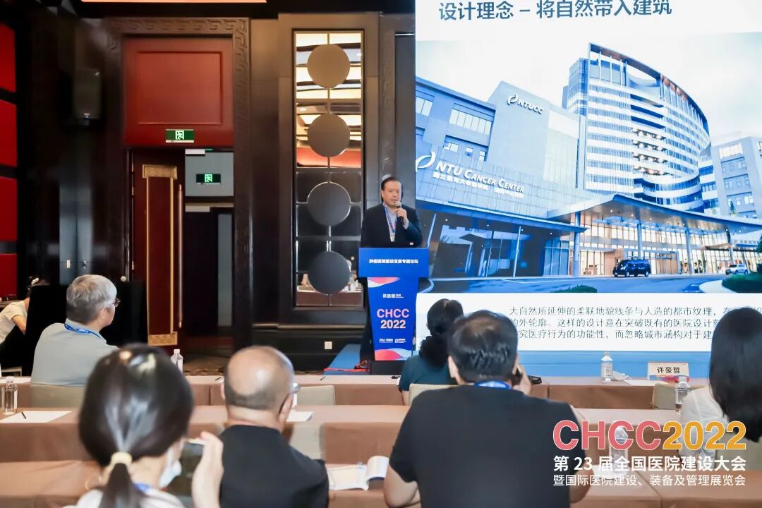 HKS上海办公室医疗规划总监、高级副总裁许豪哲在“肿瘤医院建设发展专题论坛” 发表演讲《希望灯塔——台湾大学医学院癌医中心医院设计案例解析》,分享了台大癌医的建筑造型理念、全人照护的疗愈空间及和谐自然的景观环境。