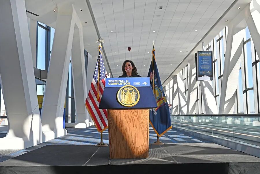 美国纽约州州长Kathy Hochul在拉瓜迪亚B航站楼西天桥开幕仪式上讲话。 | New York Governor Kathy Hochul speaks at the opening of LaGuardia Terminal B’s western skybridge.