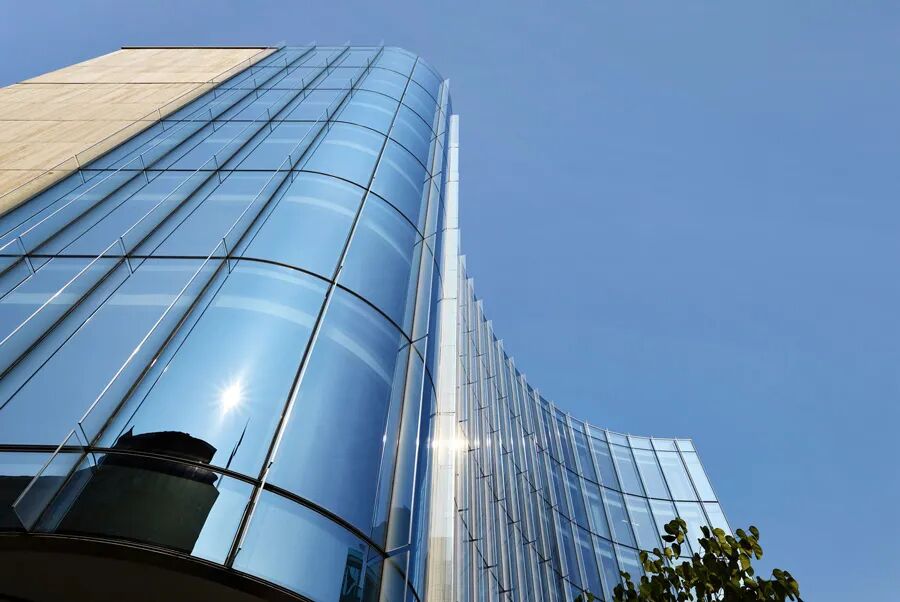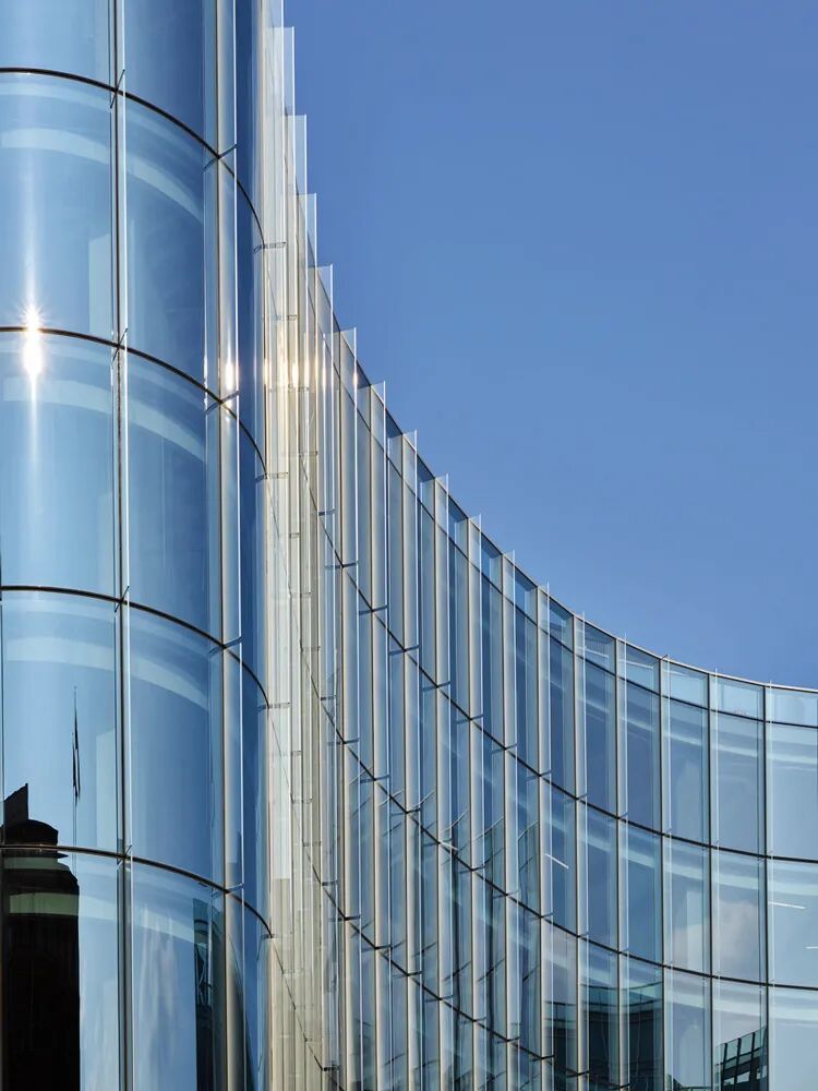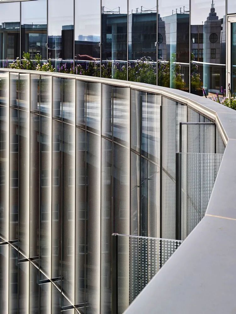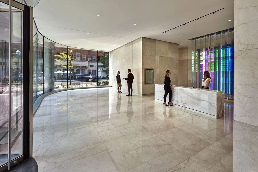 此次翻新的最大特点是覆盖建筑的东南和东侧的一个崭新的六层玻璃立面。统一的幕墙系统遵循建筑的凹面形式,创造了一种别出心裁的曲面镜效果,反射建筑周边历史悠久的杜邦环岛街区的建筑。外立面的彩釉玻璃竖框起到了遮挡光线的作用 ,同时为建筑增加了垂直和轻盈的感觉。