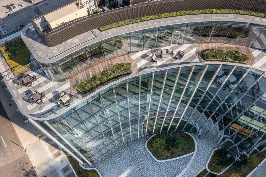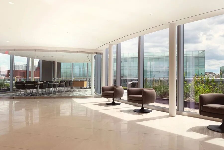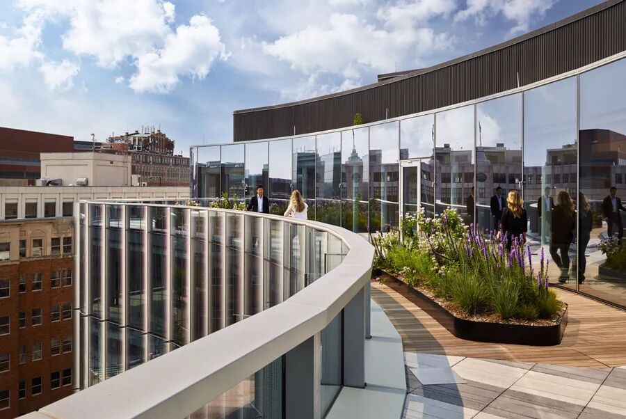 团队通过使用高效、占用面积小的空调系统,使放置机械设备的顶楼的空间空出来并改造成了共享休闲设施空间。其中包括休息室、最先进的会议设施和一个可以欣赏城市美景的屋顶露台。此次翻新将建筑耗能和用水量减少了35%,并且能够收集场地雨水。项目已获得LEED 金级认证。