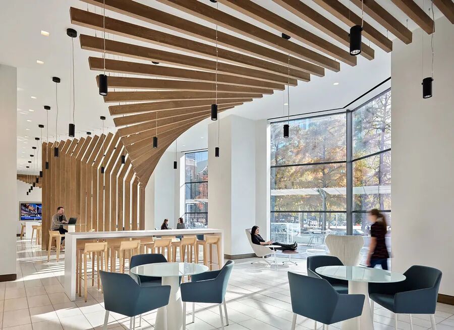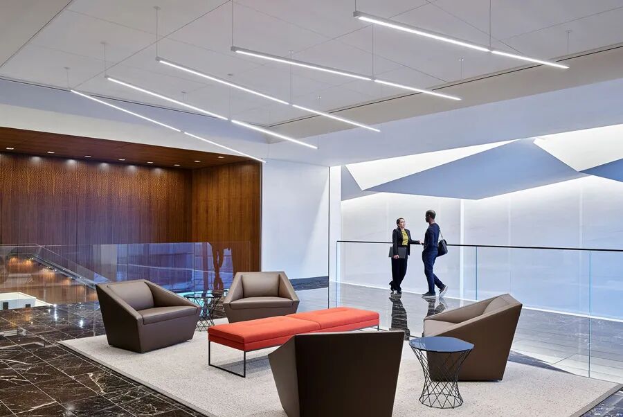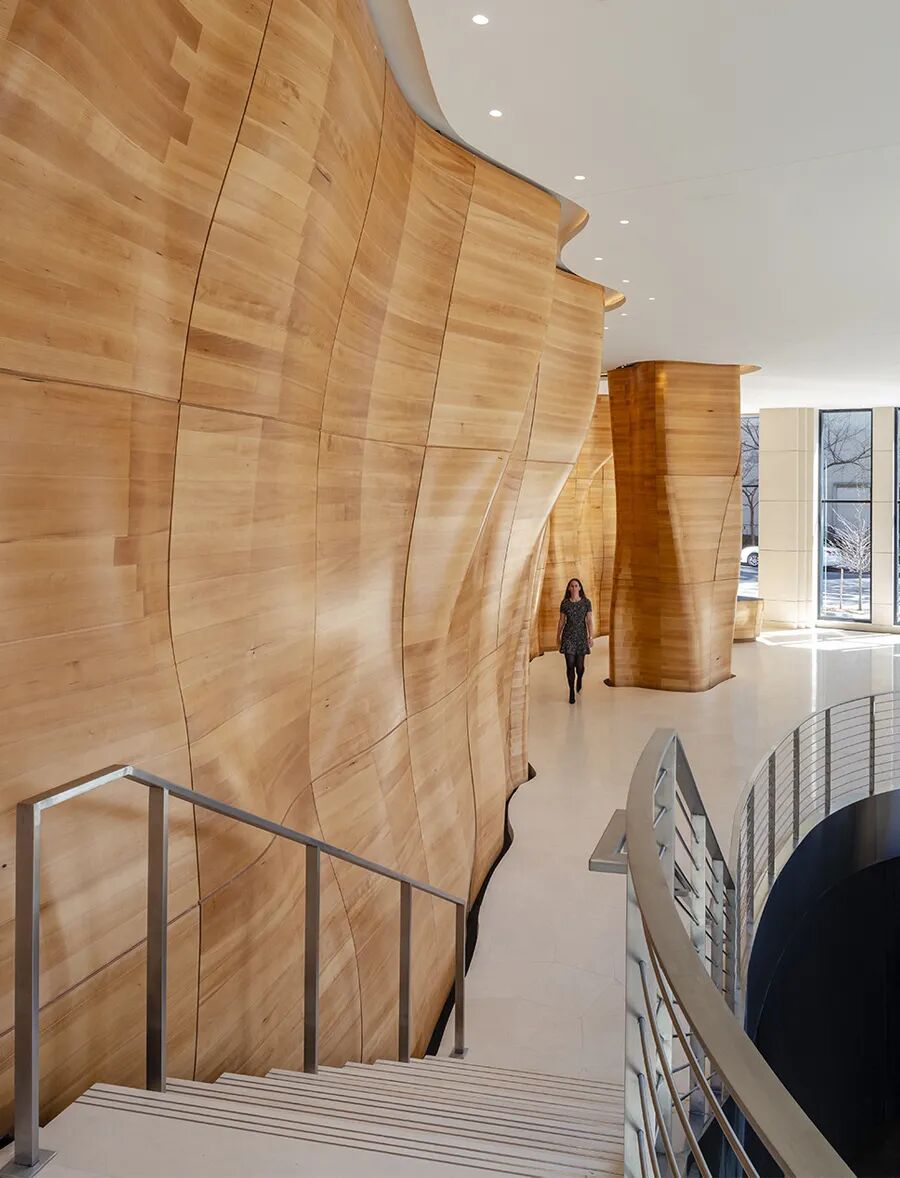 充满层次感的入口空间:进入大堂,一个高及天花板的立体雕塑墙迎接着访客。实心椴木特色装饰墙采用数控技术制作,以最优化材料使用和安装效率。主楼梯漂浮在一个新的两层中庭内,与流动、动态的雕塑墙形成互补、平衡,同时无缝地连接了之前断开的大厅。这种设计特色也体现在广场上,穿孔的铝制设计特色贯穿整个景观,并连接着主楼和副楼入口。