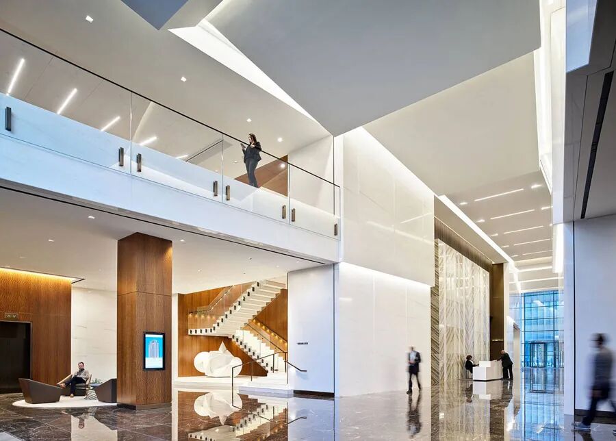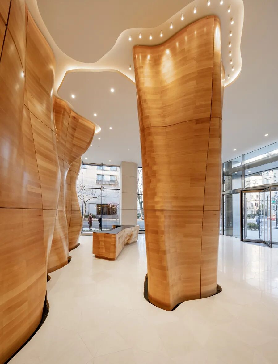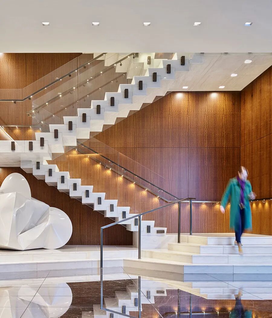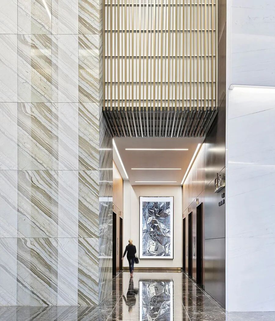 大堂具有博物馆式风格,使用了大理石,入口墙面为落地窗。大堂空间以一个大型炫彩玻璃雕塑为特色。雕塑的七彩反射光增添了装饰效果,并表达了该街区的包容性历史。