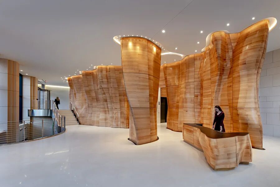 Dynamic entry sequence: A three-dimensional, floor-to-ceiling sculptural wall greets people entering the lobby. The solid basswood feature wall was fabricated using Computer Numerical Control technology optimized for efficient material use and installation. A monumental stair floats within a new two-story atrium, balancing the fluid, dynamic sculptural wall while seamlessly connecting the previously disconnected building lobbies. This connective tissue is mirrored in the front plaza, where a perforated aluminum design feature carves through the landscape and links the main and secondary building entrances.