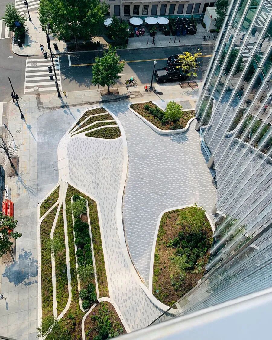 一个宽敞的新入口广场着重于人性化设计尺度,类似于“花园中的房间”由树木遮蔽。带状布局蜿蜒在整个分层广场中,形成了花盆隔墙、座椅隔墙和步行道。这种设计体现了建筑热情友好的态度,邀请访客到这个城市口袋公园里享受片刻喘息。
