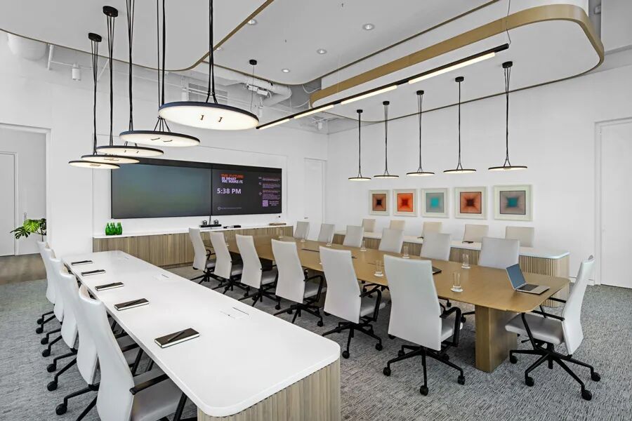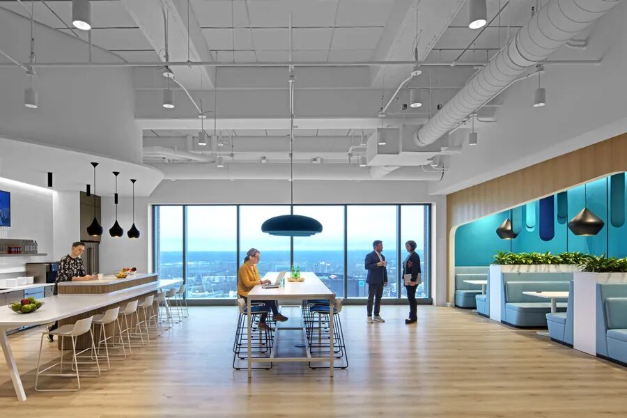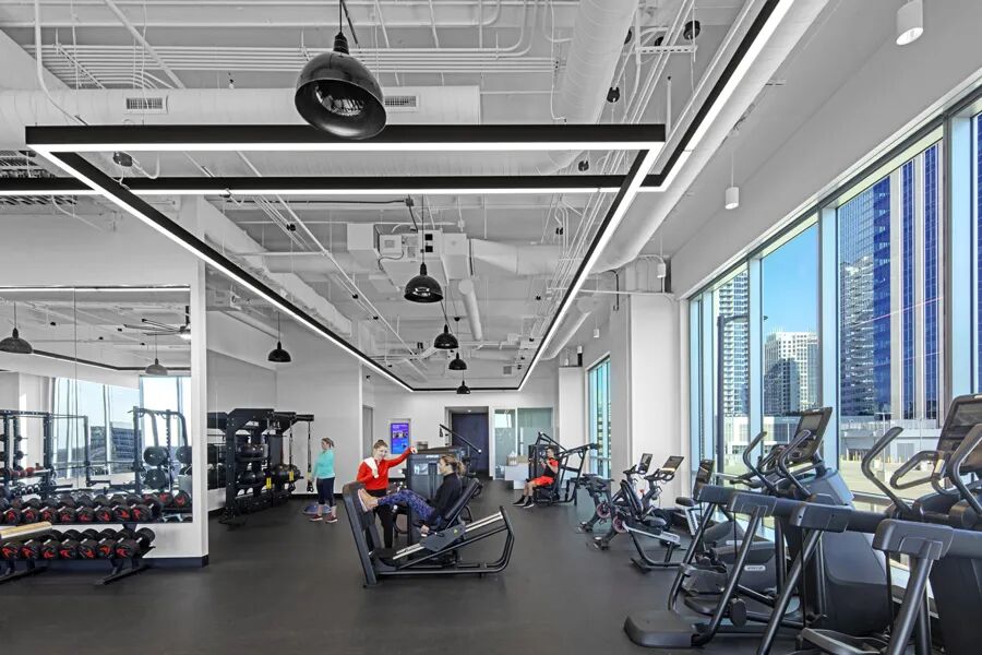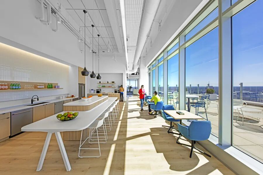 The 14th floor features a large fitness center and a wellness center with on-site healthcare providers. This amenities floor also includes a town hall space, a broadcast studio and an IT Solution Center for tech support.
