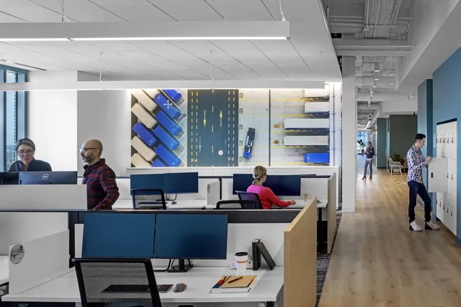 HOK’s design of the open plan office floors provides dedicated team zones and unassigned seating. This establishes neighborhoods and enables individuals to choose how and where they work.