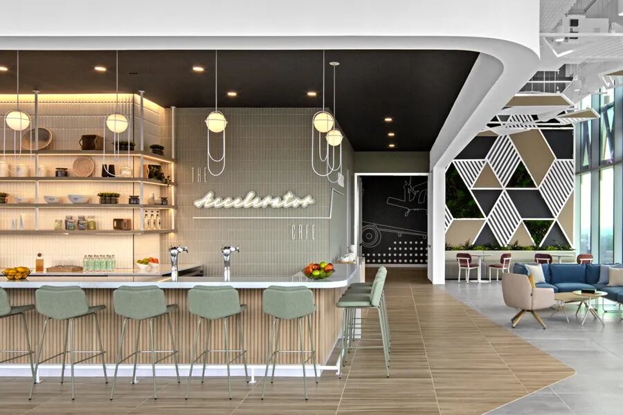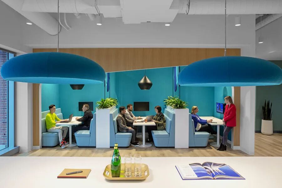 The work environments cater to the different sensory needs of neurodiverse employees. Covered booths with dynamic lighting and greenery allow people to find refuge from the louder open seating areas. Work cafés encourage employees to eat away from their desks while serving as an alternative workspace. Cafés open to outdoor seating.