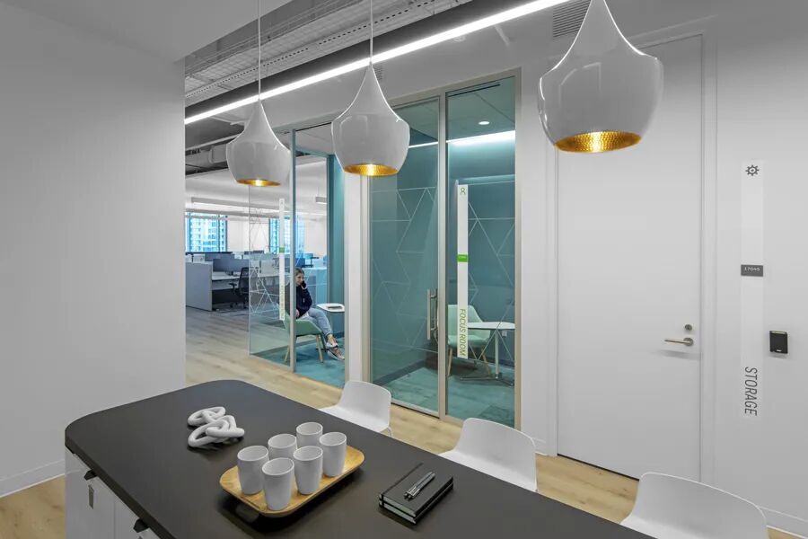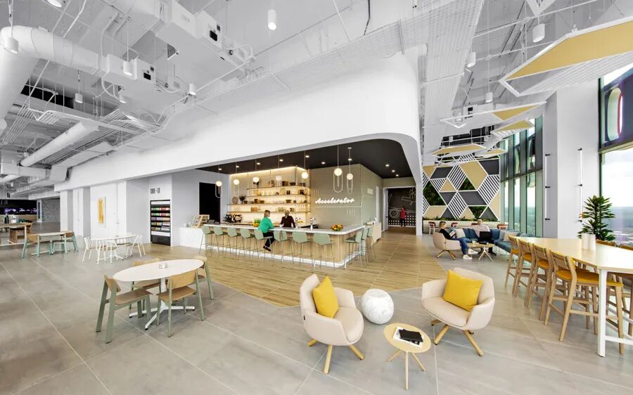 办公场所的环境也能满足神经系统多样性人群的不同感官需求。自成一体的配有灯光和绿化的小会议室,为员工提供了一个独立空间,以远离嘈杂的开放办公区域。“工作咖啡吧”鼓励员工们在自己的办公桌以外就餐,并可作为另一种工作空间来使用。而且这个咖啡吧开放室外座位。