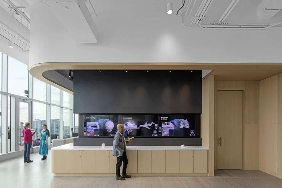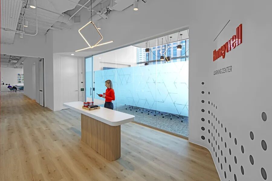 A Customer Experience Center (CXC) on the 23rd floor showcases Honeywell’s products and technologies. An interactive Immersion Room creates a customizable audiovisual experience with imagery on all four walls. The Accelerator Café and the Learning Center also are on the 23rd floor.