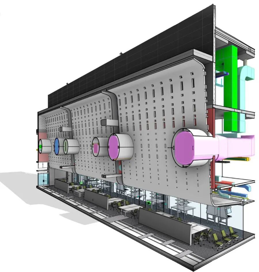 HOK的设计团队集结了建筑师、实验室与医疗规划师、室内设计师和工程师,共同打造了一个设计方案,以确保研究院新大楼的基础设施可以支撑最新的设备和最前沿的临床研究技术。设计团队总共设计了两个机械塔来提供必要的基础设施支持,分布在大楼的两侧。机械塔外墙上的陶土板以抛物线状排列,使重型设备可以在最小的干扰下被替换。