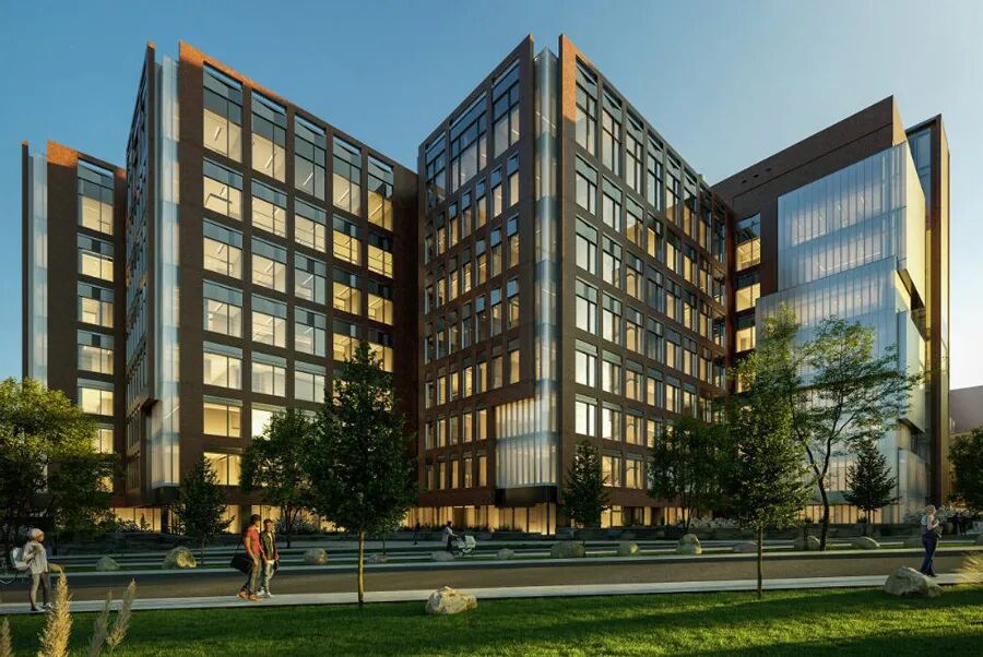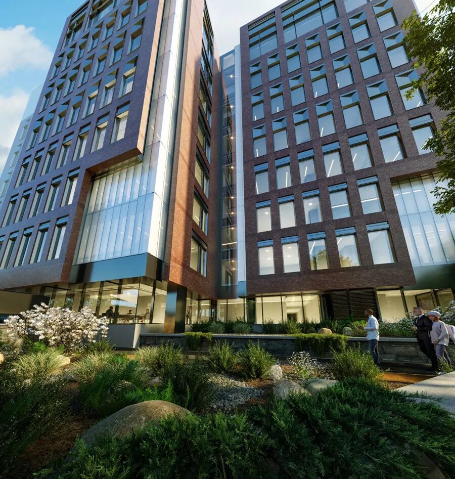 设计方案构造出由一个主楼和从主楼延伸出的三个翼楼组成的建筑。翼楼提供了足够的转角来容纳办公室和协作空间。同时,多角化的设计也让八层高的新大楼的体量分成几个部分,可以让翼楼的采光井引入的阳光照射到建筑深处。在地面层,研究院新大楼的翼楼设计提供了空间,实现了多个花园和雨水花园,从而提高了步行体验。