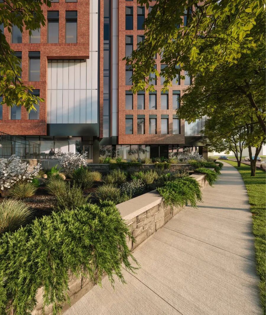 Corner gardens offer visitors, patients and places of comfort and reflection. The gardens double as bioretention gardens, harvesting stormwater from the building’s rooftop.