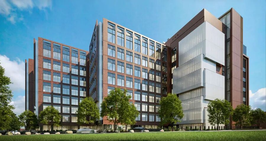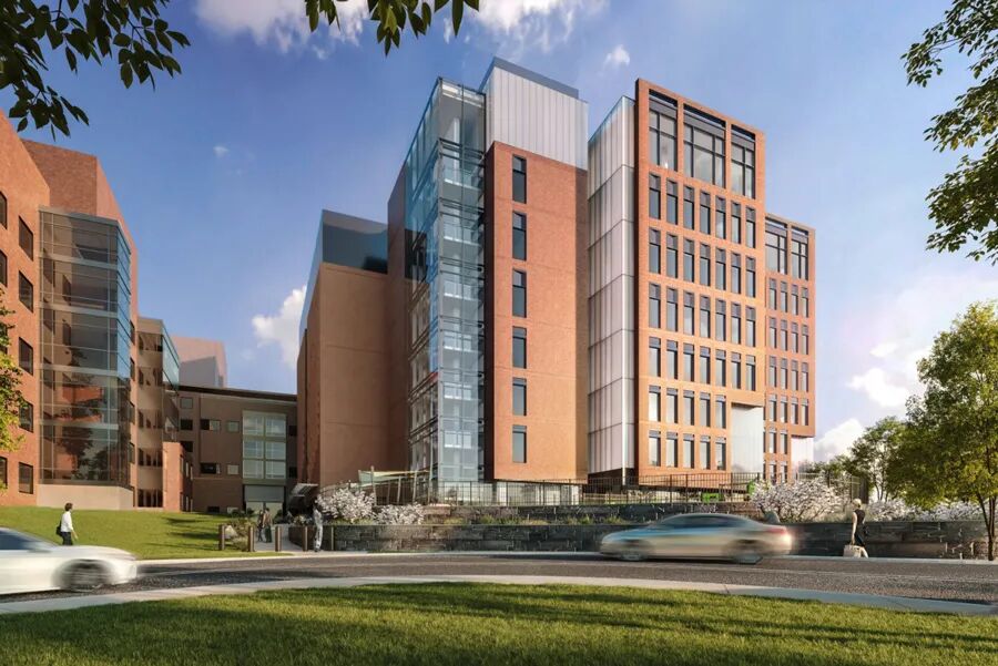 Glowing glass cubes along the corners of the building hint at the innovative research and treatment occurring inside.