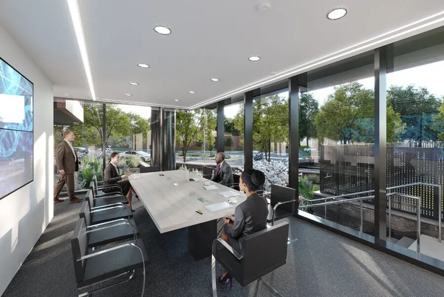 The design solution creates a building organized as three main wings extending off a main bar. The wings provide the SLRM with an abundance of corners to house offices and collaboration spaces. The multi-wing design also breaks down the massing of the eight-story building and allows lightwells between the wings to draw natural light deep into the floor plate. At ground level, the SRLM’s wings allow for a series of gardens and bioretention ponds that enhance the pedestrian experience.
