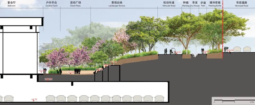 设计团队充分考虑了原有场地绿色植物的利用,尽可能地保留原有场地环境,同时对场地内植物进行选择性移植挪位,即节约了绿化成本也维护了现有的生态环境。并配合海绵城市设计体系做到资源再生利用最大化,尊重自然,保护环境,充分利用现有资源,减少对原有生态系统的改造。