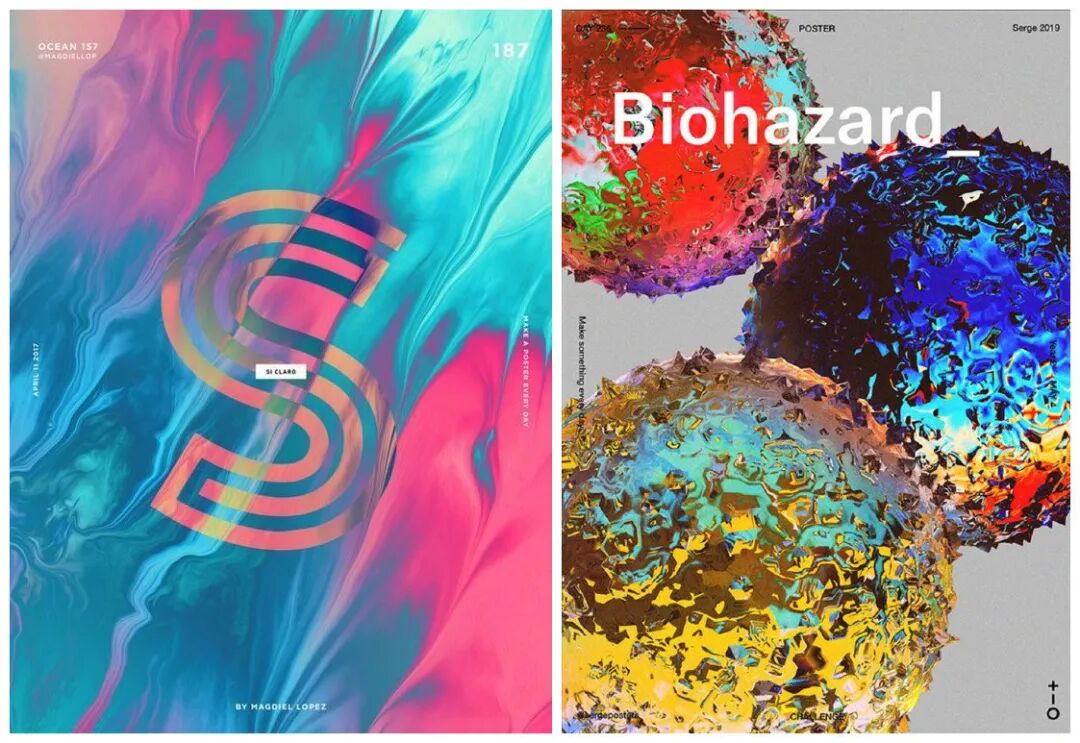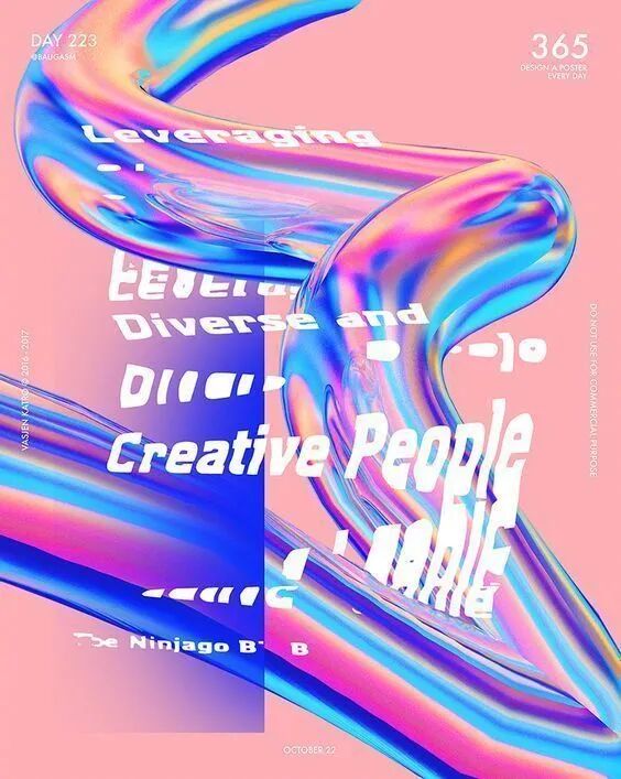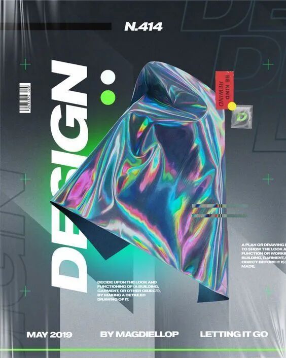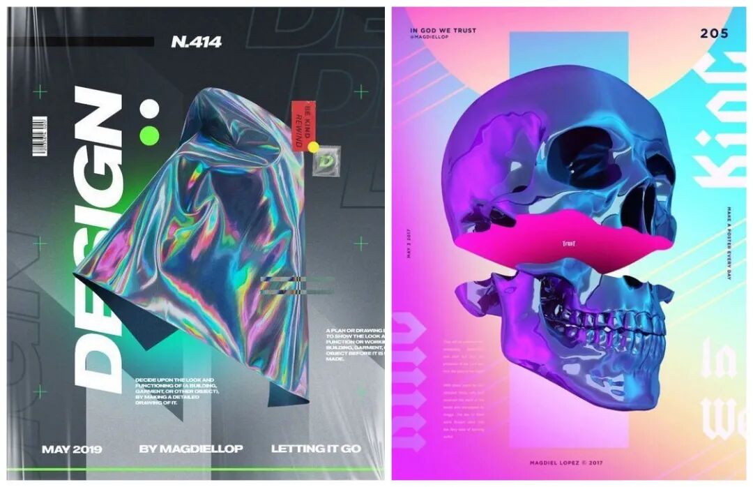 镭射风格是科技下的视觉产物,在一定的质感上呈现出迷幻的感觉。伴随着今年酸性设计的浪潮,也被许多设计广泛的运用。在平面设计中是视觉设计上的新突破,在很多设计上潜移默化的进行配色搭配。