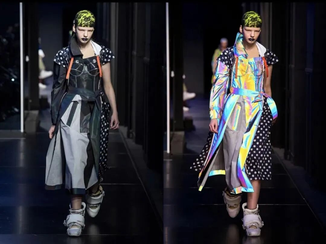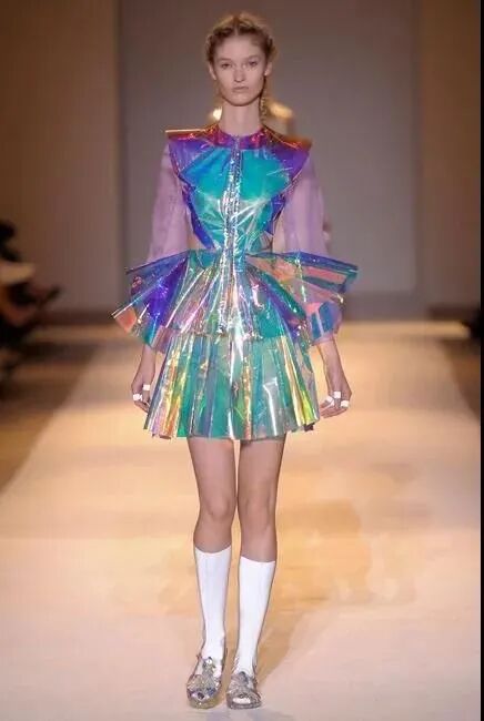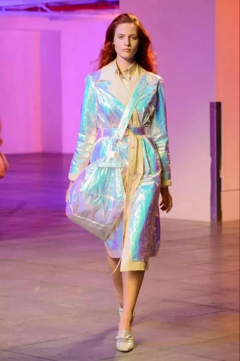 其实镭射风格已经在驰骋时尚圈很久了,迷幻、科技、复古和摇滚都逐渐让设计师们爱上了这种风格。色彩鲜艳亮丽,不规则渐变梯度和造型上的无规则设计都注入了年轻活力的气息。