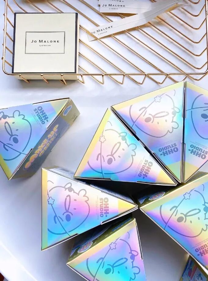 在前几年服装设计领域,是比较流行的,镭射衣、镭射鞋,镭射包等当时都获得部分人的喜爱,于是一些平面设计师跨界汲取灵感,将这种特殊视觉感受应用于平面设计中,形成一种新的流行风格。在包装设计,平面设计和服装设计等大量出现。