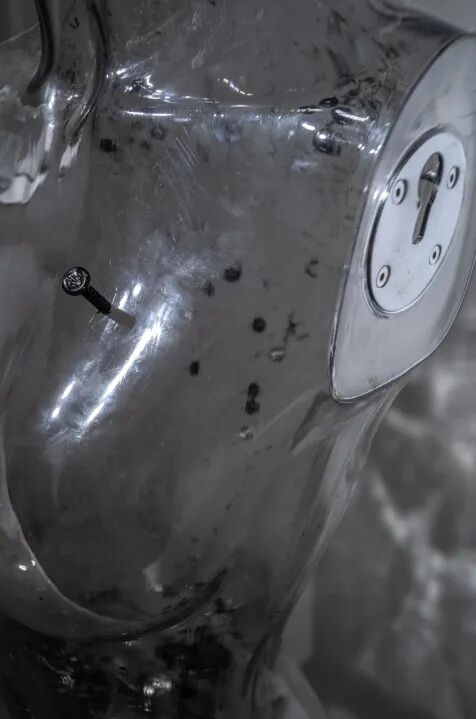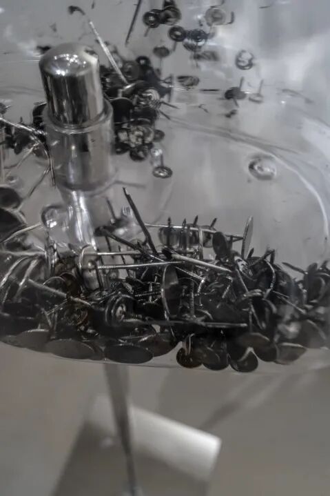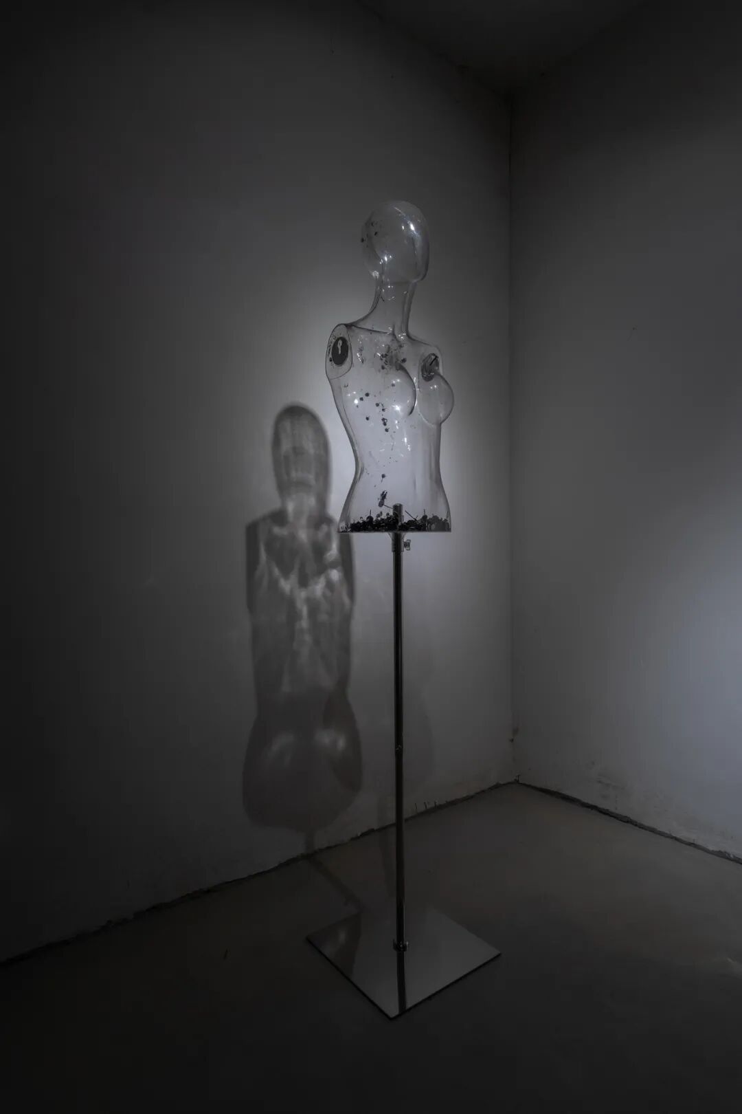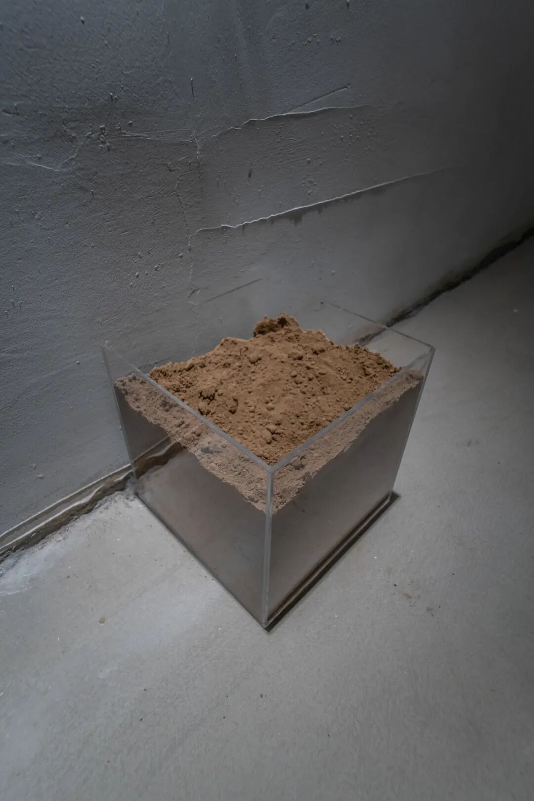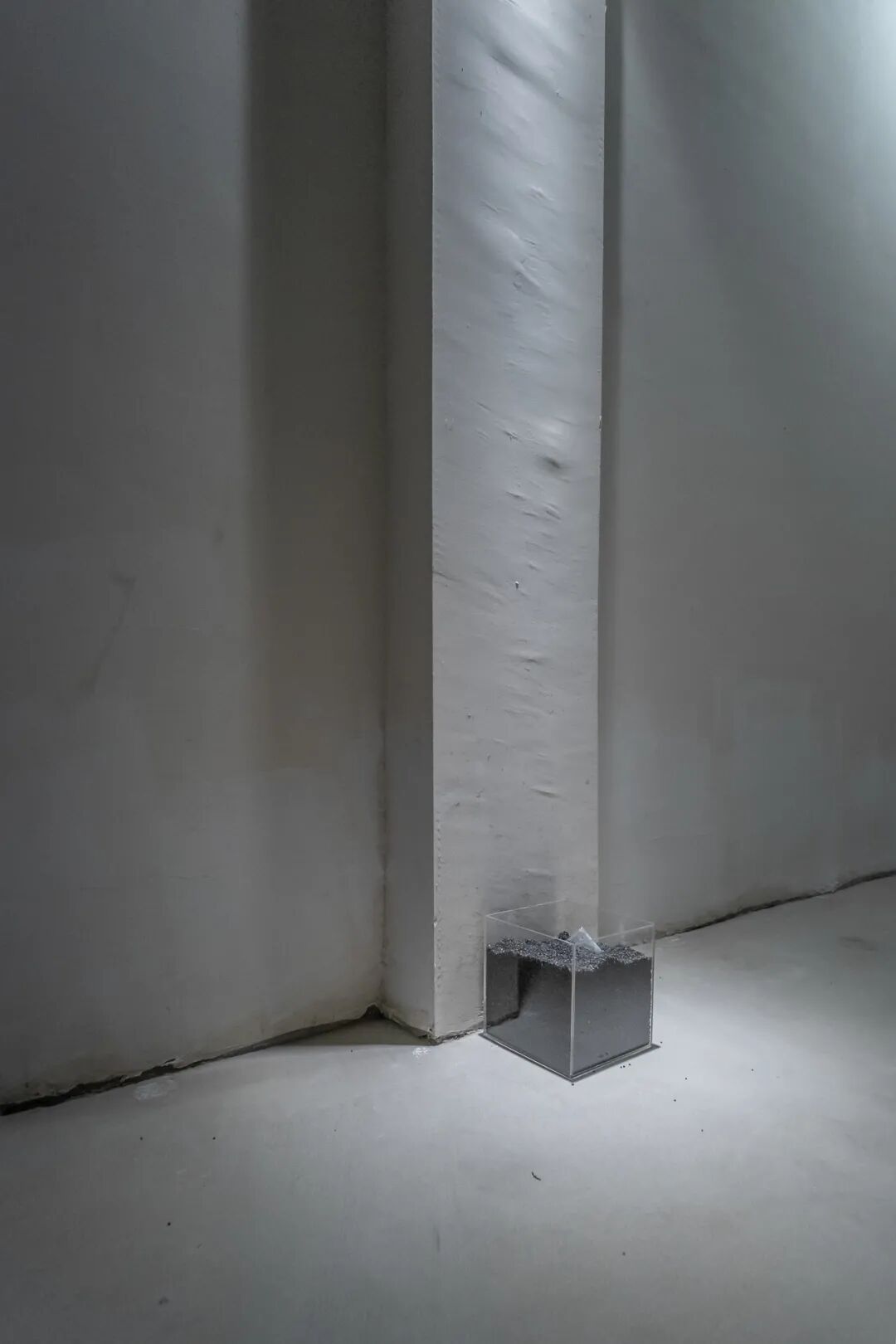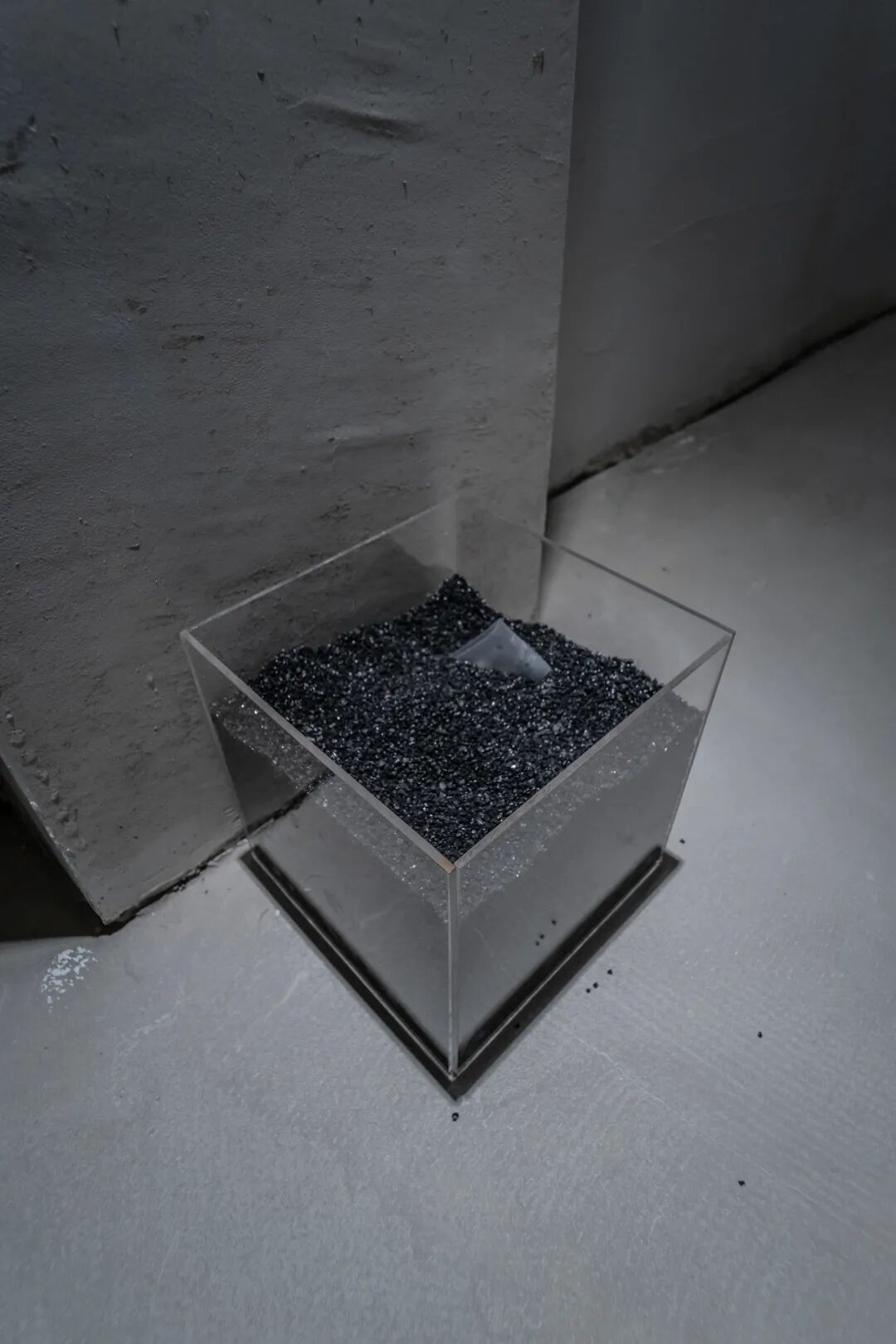 选择对讲机作为装置的主体,很大一部分原因是其一对多的对话关系,以及根据信号强弱所影响音量稳 定的特性。将对讲机置于玻璃容器中,在通过掩埋于不同介质的方式来使声音传达出不同的质感。在构 建中,自我的声音被埋藏,声音的质感被异化,呈现出一种无人应答的状态。而在本次的参展过程中, 我认识到作品的摆放空间也是构成作品很重要的一部分,作为展览整体中的一环,自我与他人的协调是 不可分割的,作品与作品间的独特磁场也是需要彼此勾连影响的。