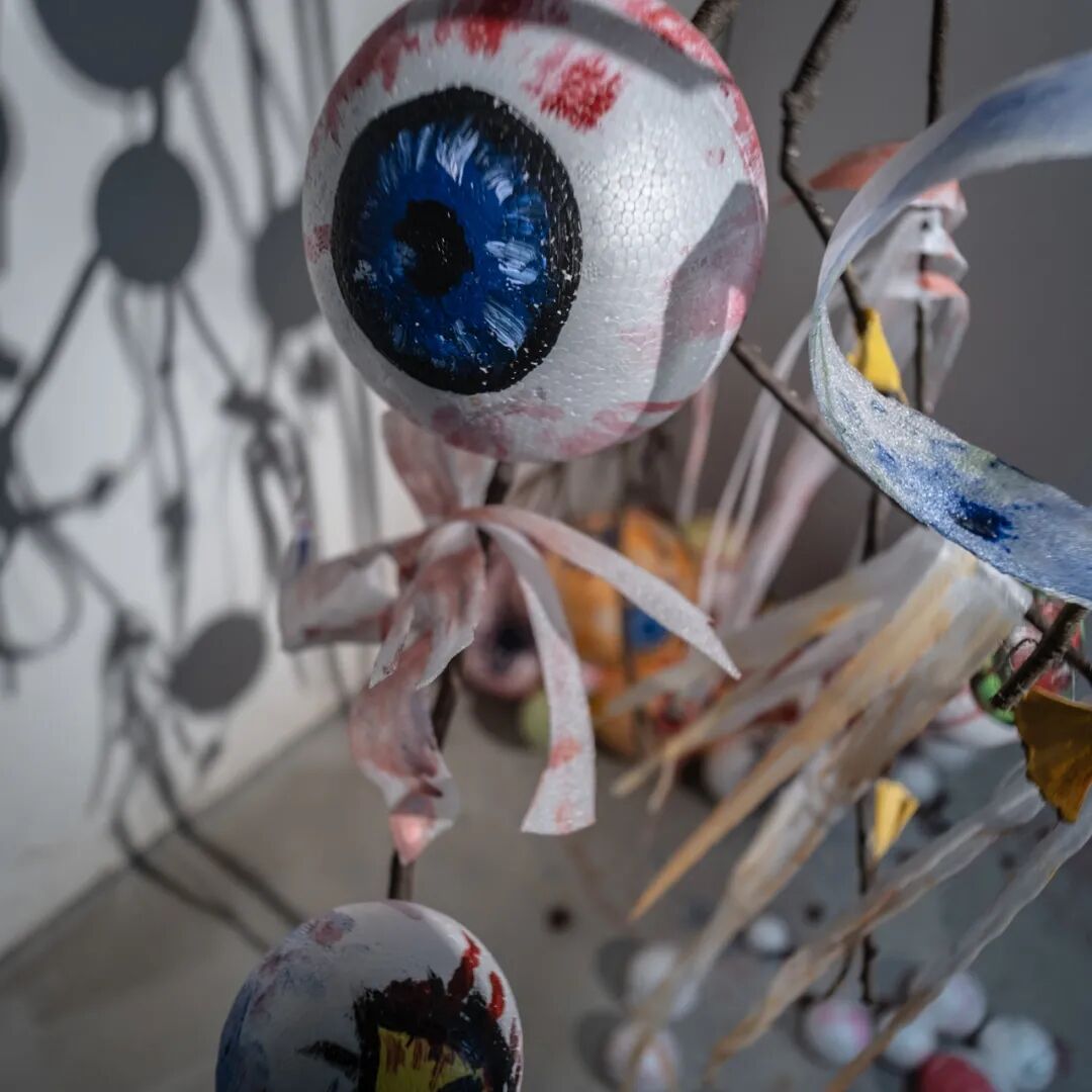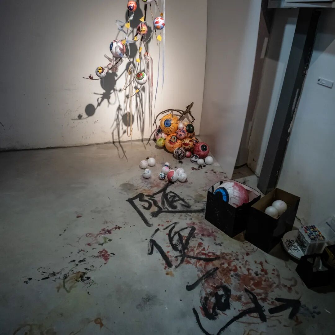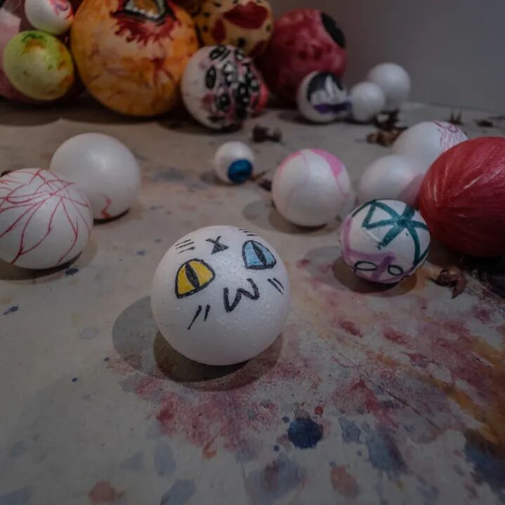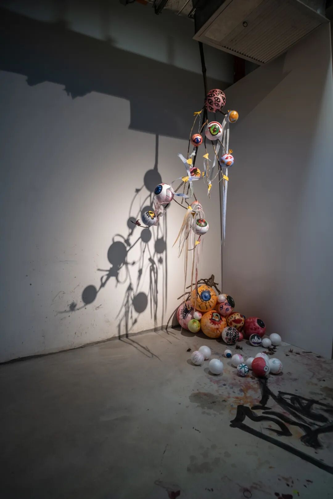 最初想的是做一个轻松一点的小空间,主要的创作者不在于我,而是观众。后来布展的时候,我又在这基础上加了自己的装置,从不同角度看世界的眼球。小空间的另一个部分是可以让观众自由发挥的地方,他们可以选择把画的球带走或是留下。我看到有的人并不是在球上画眼睛,而是别的图像,所以看世界的方式不一定是通过眼睛,每个人的方式都不一样。等最后把这些泡沫球收集起来的时候,我会得到与展览刚开始截然不同的效果。从观者的角度去看便是可持续输入的信号,一切都是充满未知的。