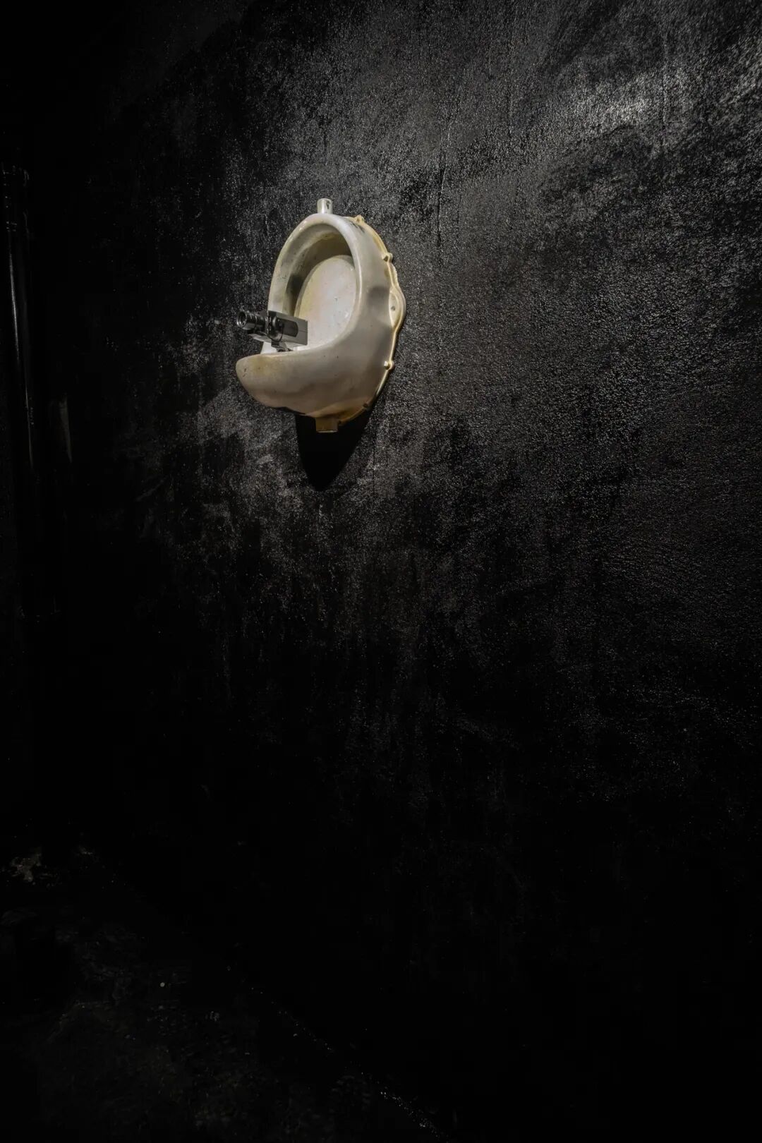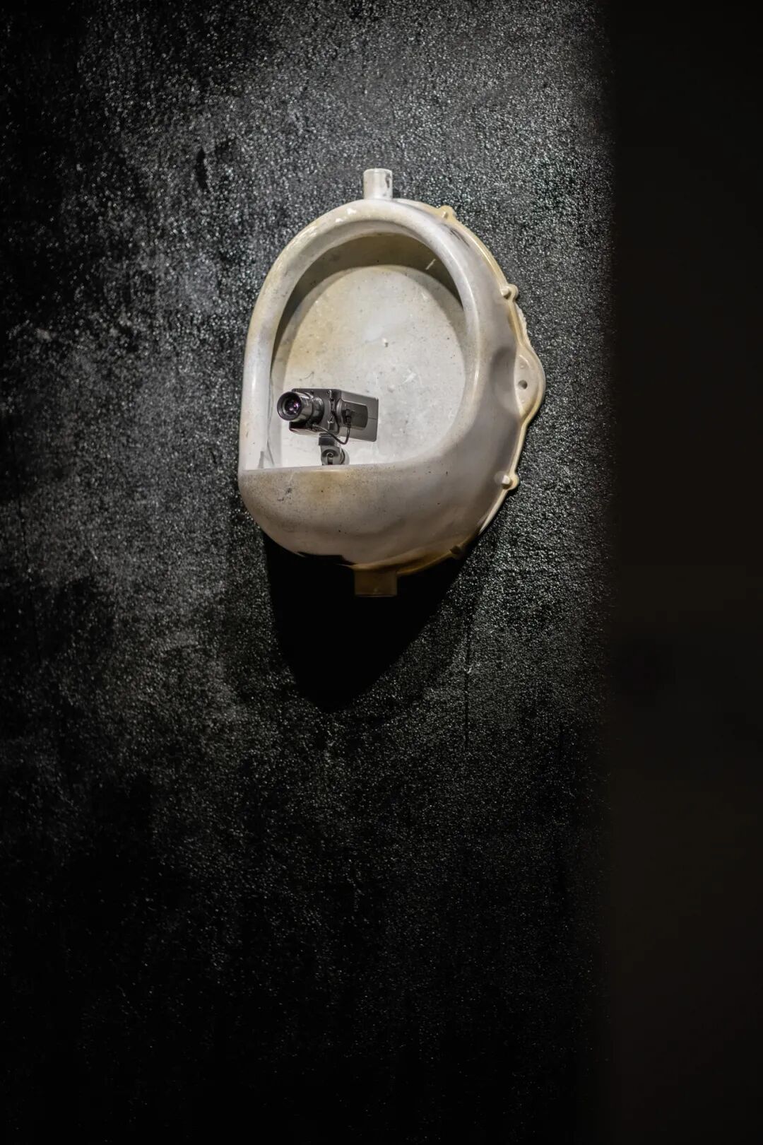 “探头”这件作品更多想讨论的是一种隐私的空间被挤压的感觉。就是我个人来说就是对一些平静的不合理却又被忽视的物体,比较感兴趣。就当摄像头已经变成一种生活中的静物时候,我们其实是会忽略“它”的。所以我的作品里选择最先出现的是由聚光灯聚焦的小便器。然后有一个监控从小便器的洞里面向外凝视,其实最开始就源于,我在发呆的时候望向一些洞的想象。然后我把两面墙的监控隐藏起来,摆放也是静物式的。当日常平静摆在那里的东西换了一个场域,会激起大家不管是想法上还是心情上波动的时候这就是我想要的现场。