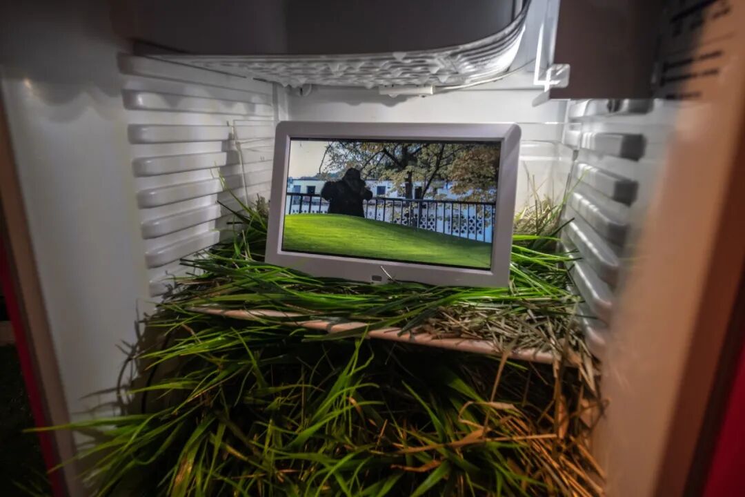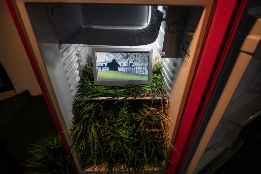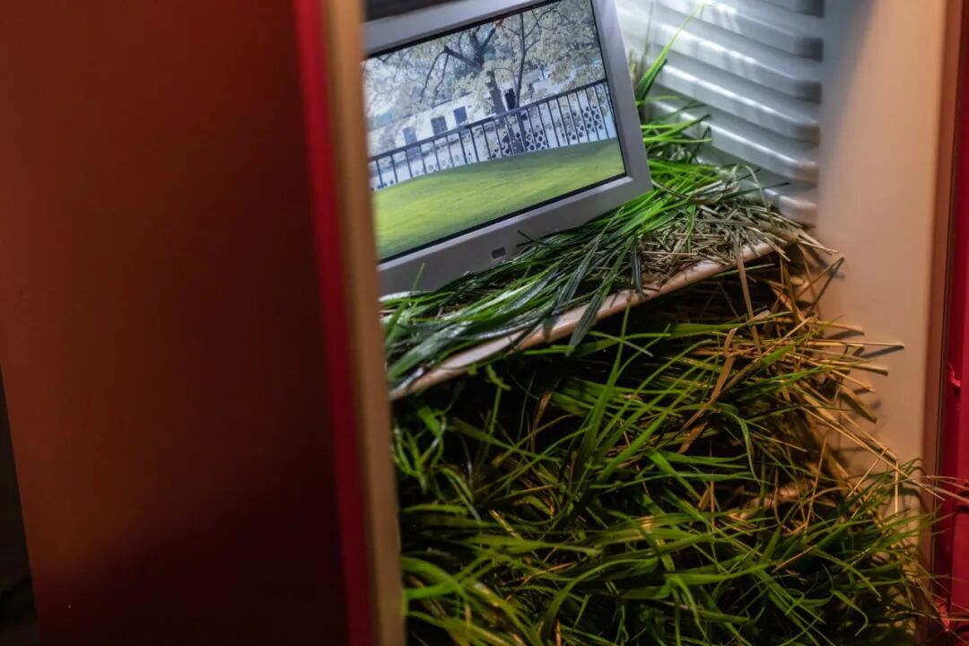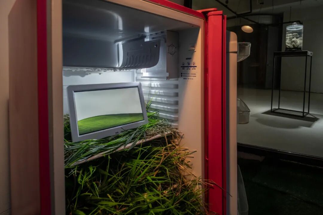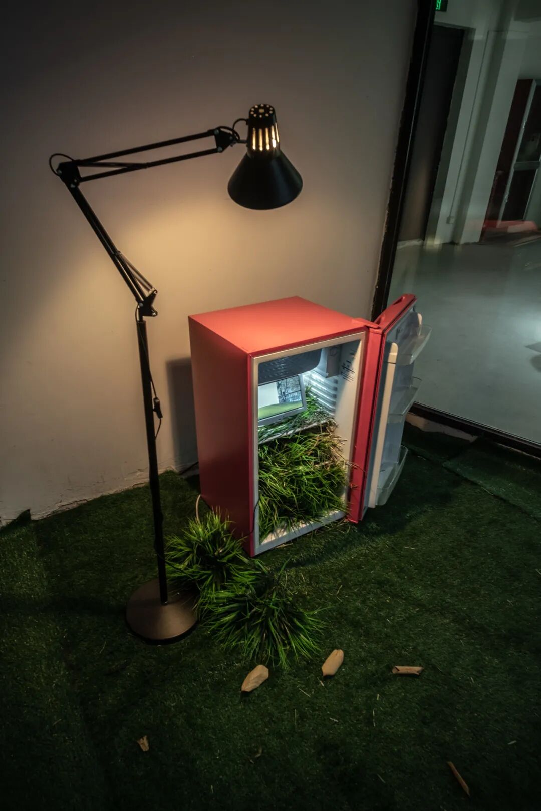 此作品名为《掉进兔子洞》,取自《爱丽丝梦游仙境》第一章。爱丽丝跟随兔子进入另一个世界,这个艳粉色的冰箱正是异世界的入口。其中有一点关于童话的插曲——一个有播放窗外风景倒影相关的显示屏。