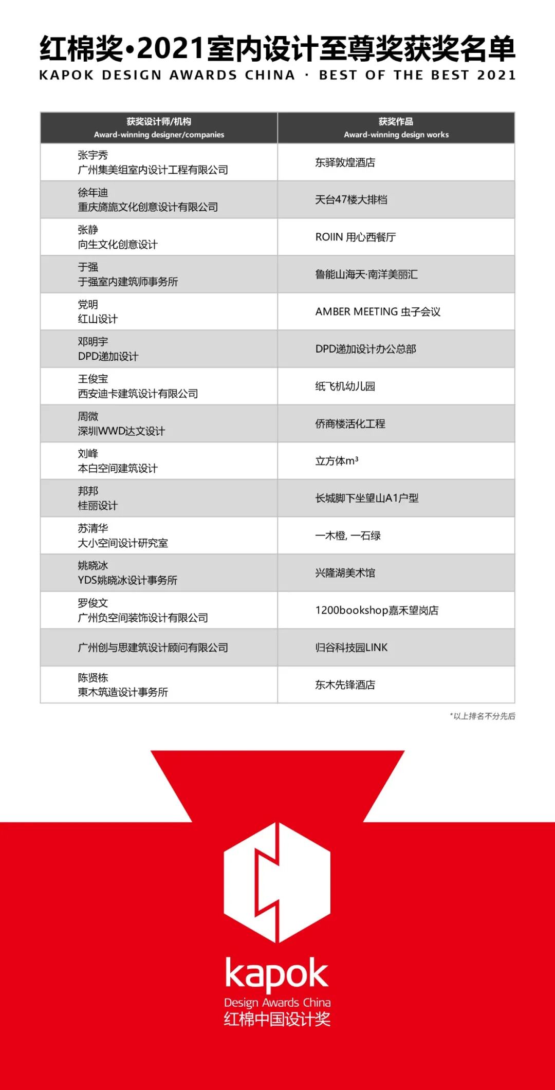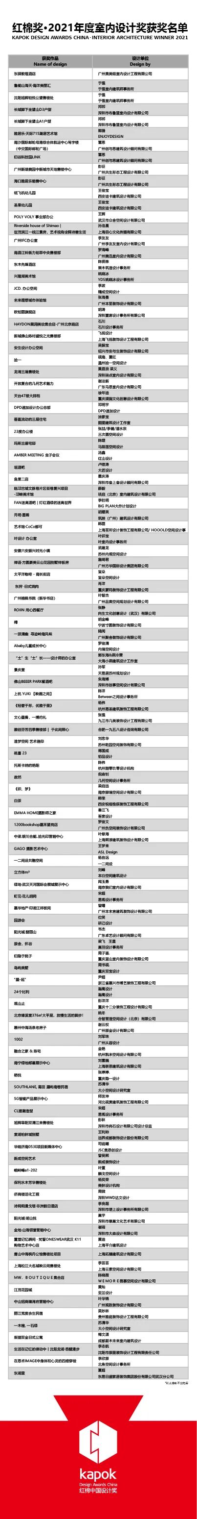 经红棉中国设计奖评审委员会依据奖项的评审标准进行评审评选出110个作品获“红棉中国设计奖·2021室内设计奖”,经过第二轮评审,当中15个优秀作品荣膺红棉奖·室内设计最高荣誉——“红棉中国设计奖·2021室内设计至尊奖”。