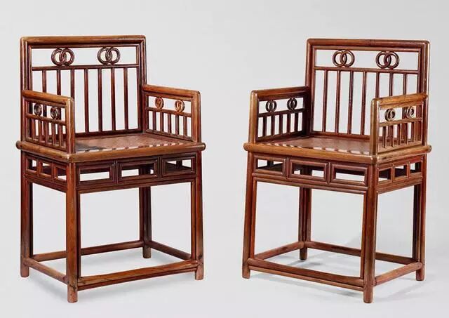 椅背较低、背高度与扶手高度,相差无几。扶手、靠背与腿子,圆棍形居多。靠背无侧脚,直立于座面。
