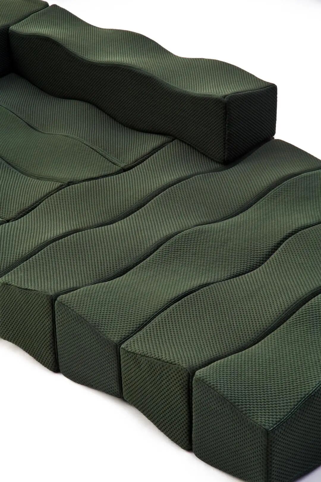 这组设计作品名为“海绵做的海”,利用波形的周期性创造了一种新型模块化软包结构,同一种单元可以自由组合以及像大海一般无限延展:一张沙发可以瞬间变成一张床,或者一个儿童乐园,或者是一件屏风对空间进行分割,又或者打散为数个独立的坐具或靠垫。就像海水一样,他没有固定的形态,放进什么容器就是什么轮廓,而这个容器就是不同使用者的需求和偏好。