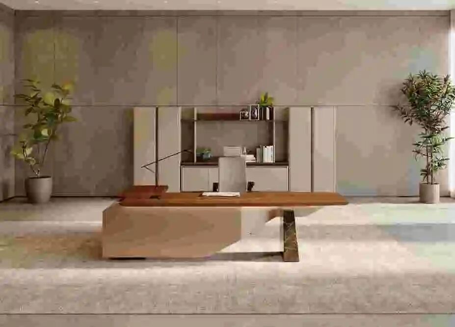 Nova CEO Desk 是CEO顶层办公空间的系统性家具设计,包括办公桌、背柜、沙发、茶几等。当你的手臂靠在办公桌最细腻的桌板表面时,你会注意到一条优美的金属曲线横贯木板桌面。在底部石材的支撑下,桌子虽然悬浮在空中,但依旧十分的稳定。
