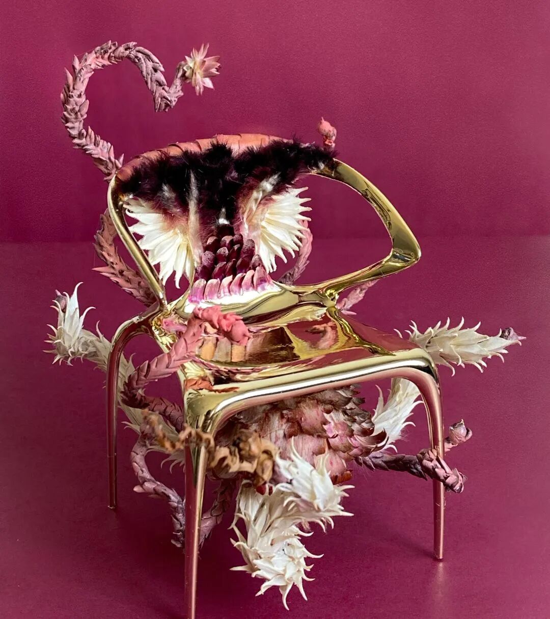 来自罗奇堡AVA椅模型改造,金色的Roche Bobois 罗奇堡AVA椅,有着曼妙的曲线,植物与其共生,融为一体。金属的椅座倒影出椅背上的植物花纹,机械迷幻。寄生在椅座的花朵妖娆的触手,肆意探索周围的世界。灵感来源于不明生物。