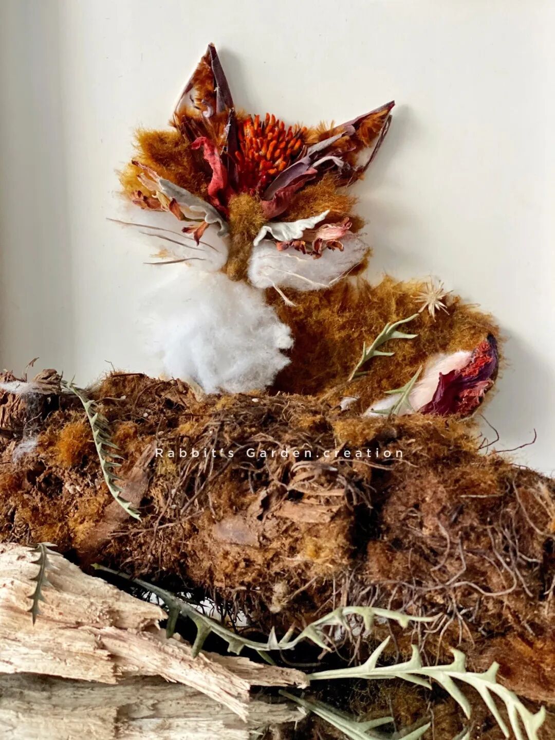 小狐狸团子的主体材料是一种植物的根部,它有着天然的金色毛毛,这便是这个作品的灵感来源了。春天的森林生机勃勃,一只叫团子的小狐狸正在闭着眼睛晒太阳。它的小脚蜷缩着,尾巴也一卷一卷的,雪白和棕色的毛发,被风梳理着,仙气满满。