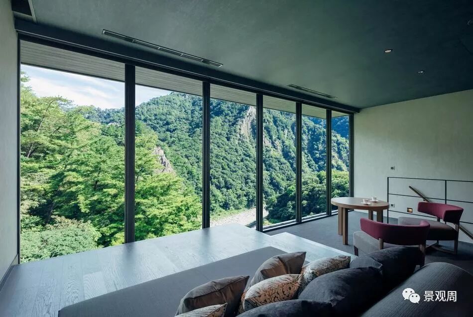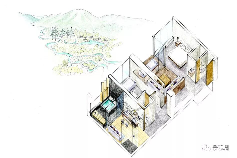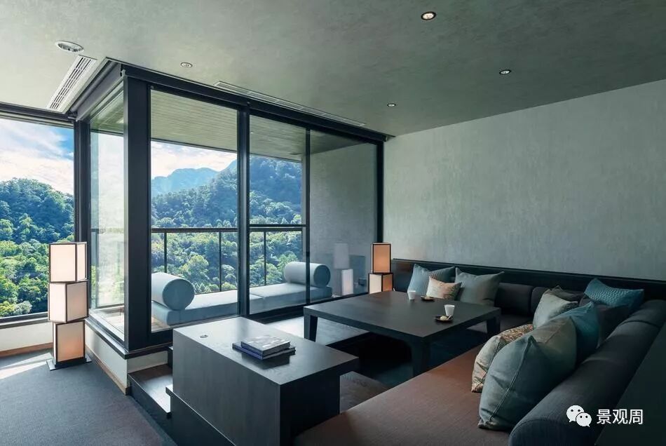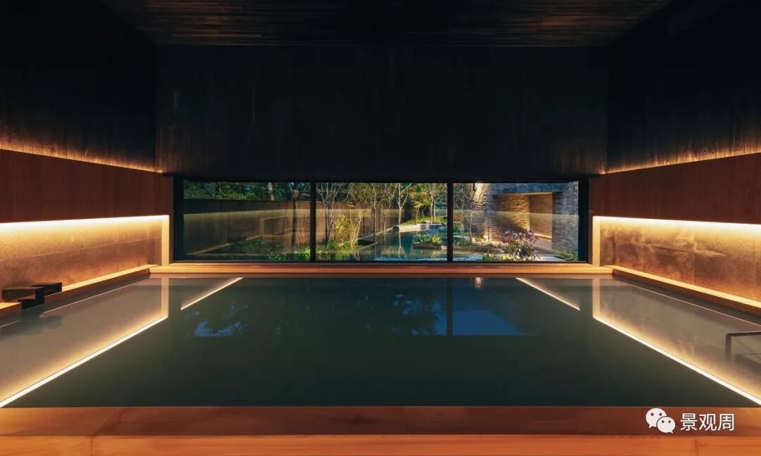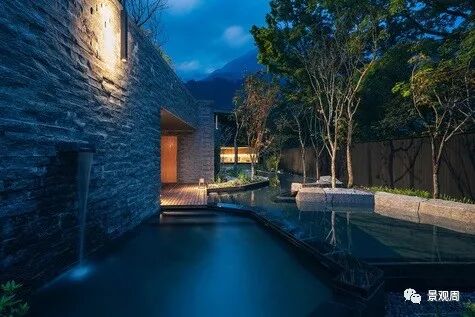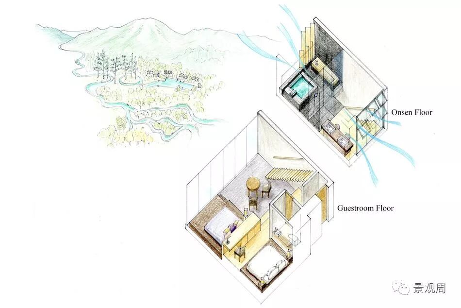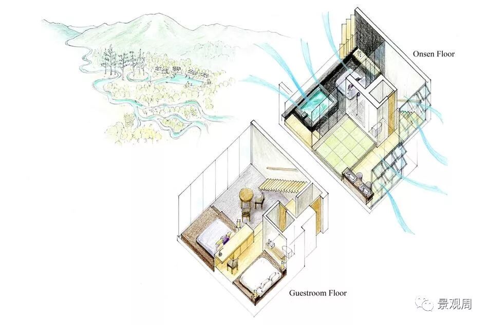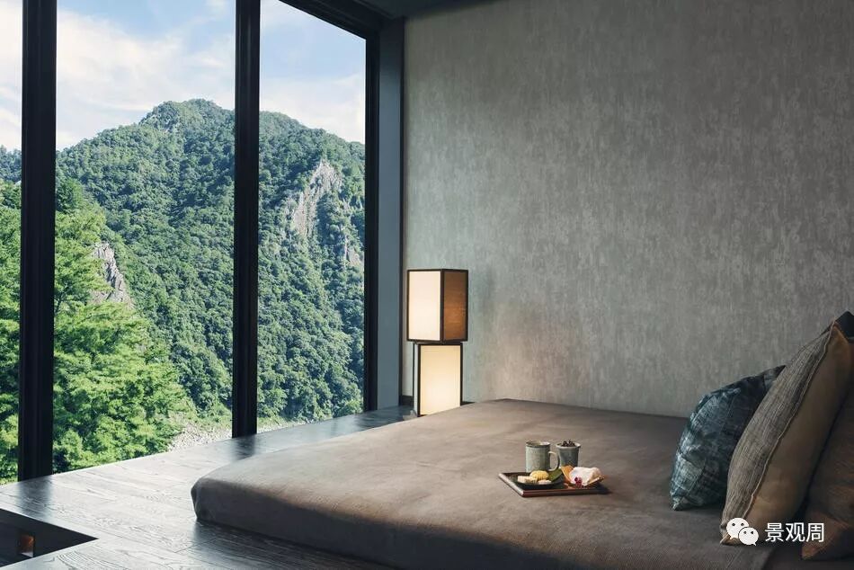 虹夕诺雅谷关坐落在被山峦包围的山脊上一处较为平坦的位置,就好象是一个漂浮在山顶的花园,由于四周的山脉还带来了丰富的地下泉水和温泉,因此我们把度假村的整体设计成一个“水之庭园”。