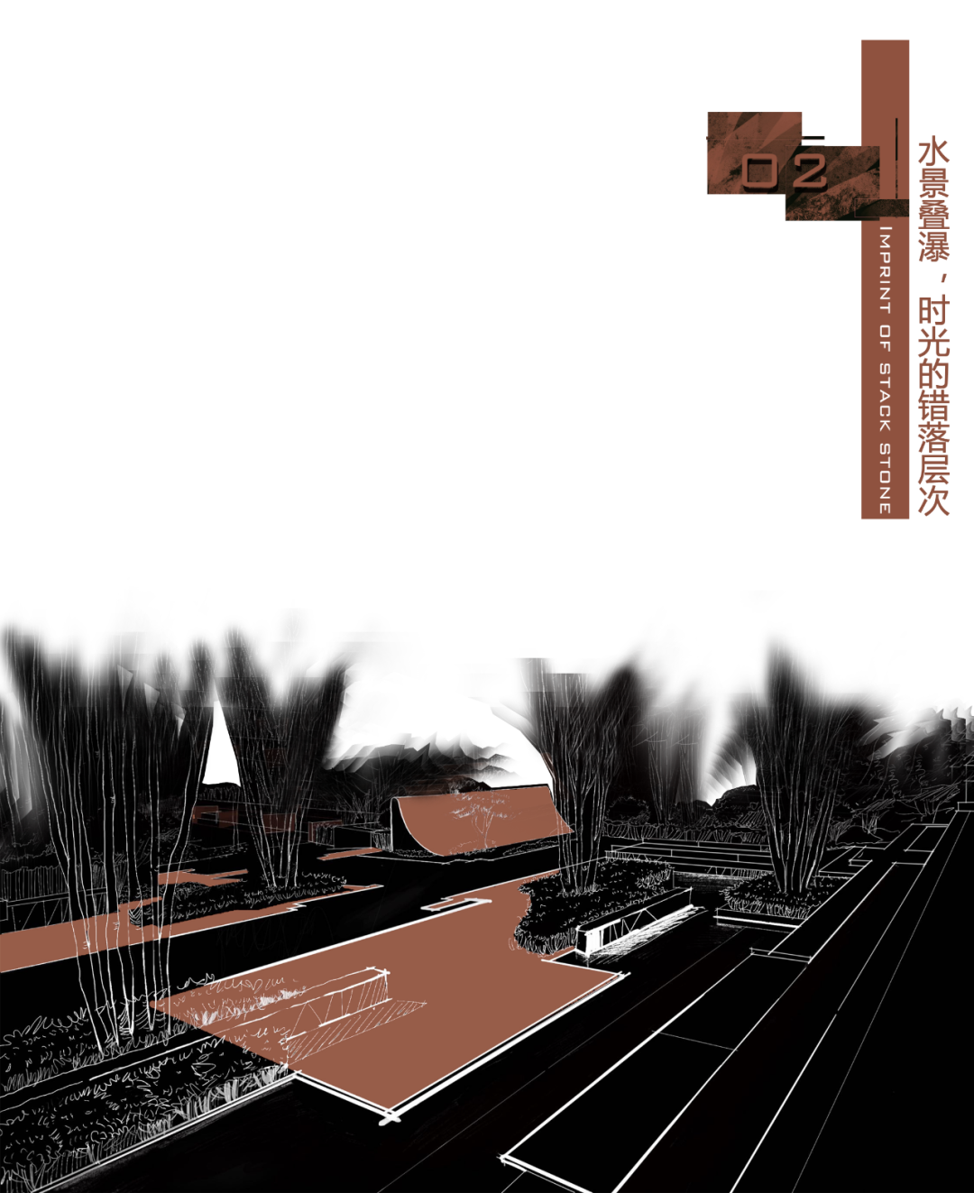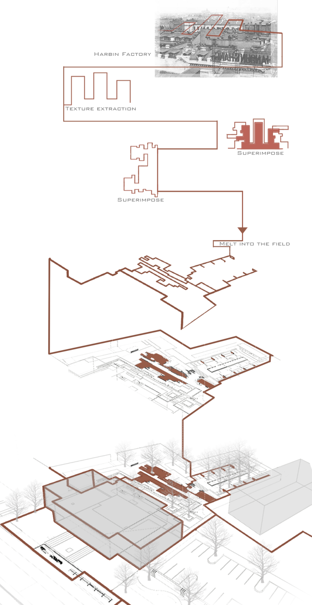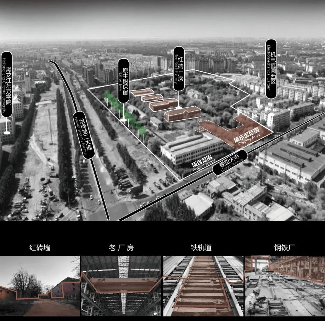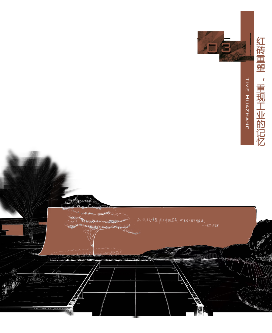 经典的砖红色勾起人们对工业老城大工厂时代的回忆,于是我们便抓住这个契机点,希望通过场景中关于红砖主基调的设计,以现代化的手法重新演绎呈现;我们追溯的场地印象,对场地进行一个肌理的提取,重现工业记忆符号,将肌理重组 、叠加、再组合、融入整个场地,景观与建筑统一语言融为一体,同时复刻还原哈尔滨工厂的文化气质与城中的生活记忆点,贯穿到整个设计之中。