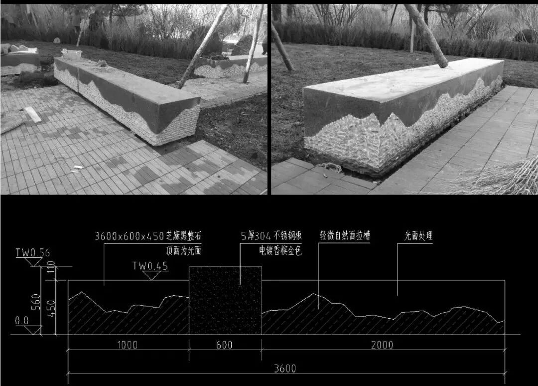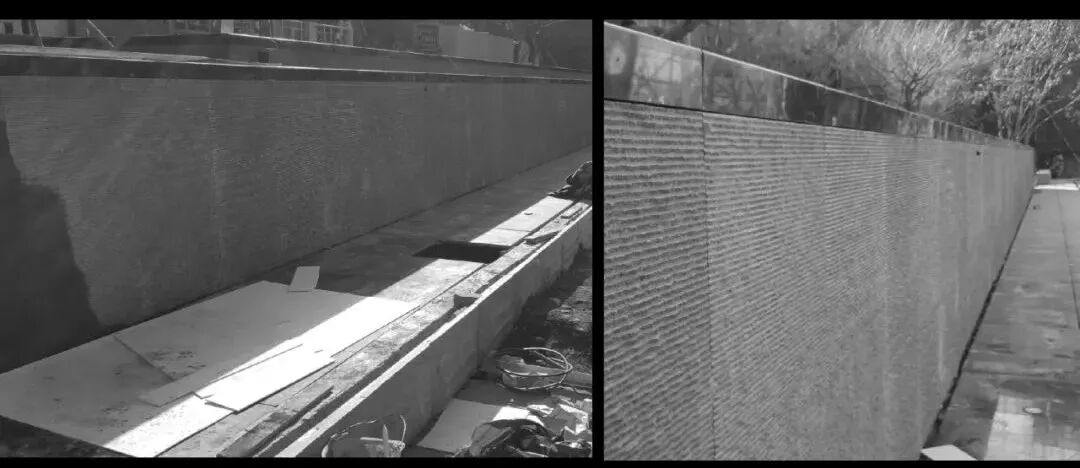 施工难点:①水景跌水饰面石材材料选用,最开始选用了各种样式的流水石,颜色差异较大,颜色上也考虑刷漆二次上色处理,效果都不理想。最终效果最接近是采用芝麻黑花岗石拉槽,在石材湿面情况下颜色能满足效果。