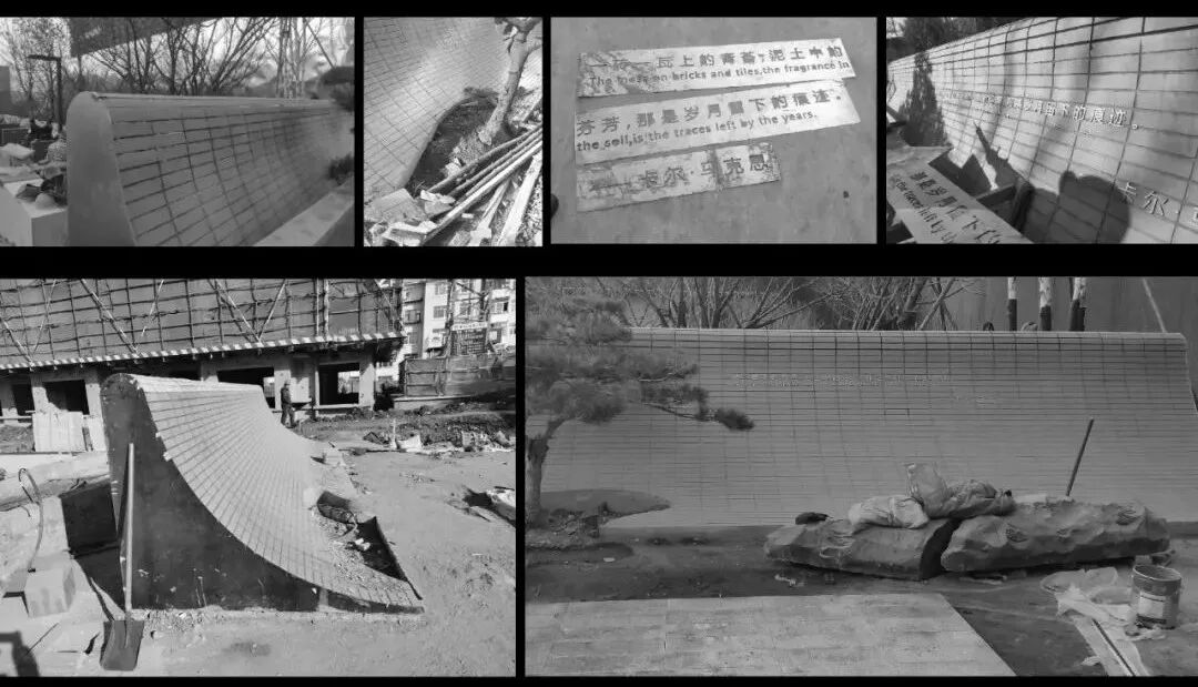 施工难点:①弧形景墙由于普通砖无法弧形贴面,经过饰面材料筛选,最终引进新材料软瓷劈开砖贴面,软瓷劈开砖可根据弧形进行弯折。②树池要嵌入到景墙中,极其考验现场施工把控;