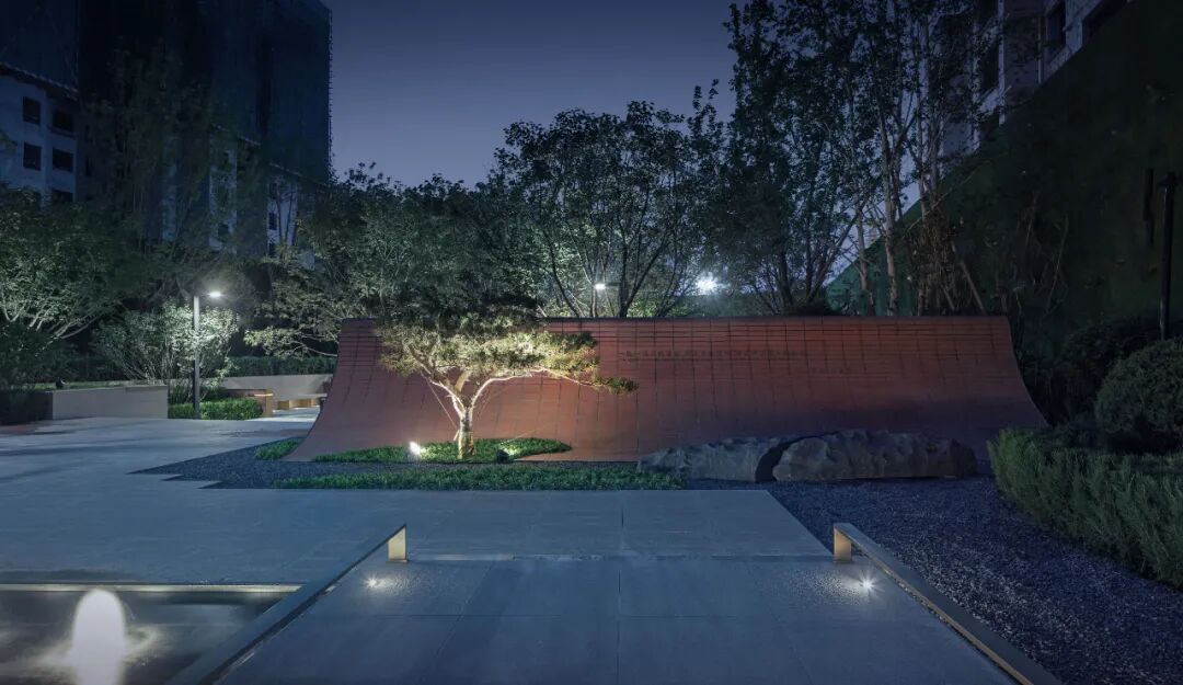 红色砖块打造的弧形景墙作背景,取自迎客松的意境的一颗松,生机盎然的绿与厚重的砖红色巧妙搭配,构成一幅禅意画卷,稳如泰山的石块,再铺以温和的草坪,为生硬冰冷的石景墙添上一抹柔美。