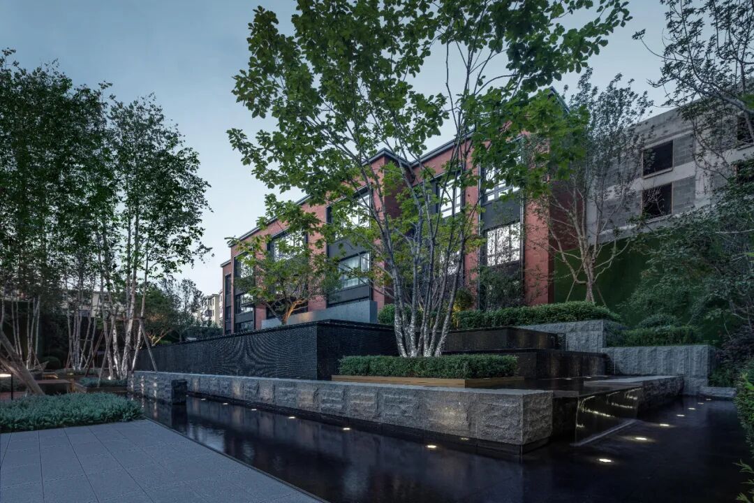 以"时光乐曲·精奢生活"为设计主题,用红砖去分割、围合,创造视觉的丰富性与多样性,这种纵与横、线与面的立体构图,让穿梭其间的人们既能沉浸地感知时空,又有探索和交流的余地,搭配稳重的黑灰色,辅以金色的细节点缀,于斑驳中显露出精致。