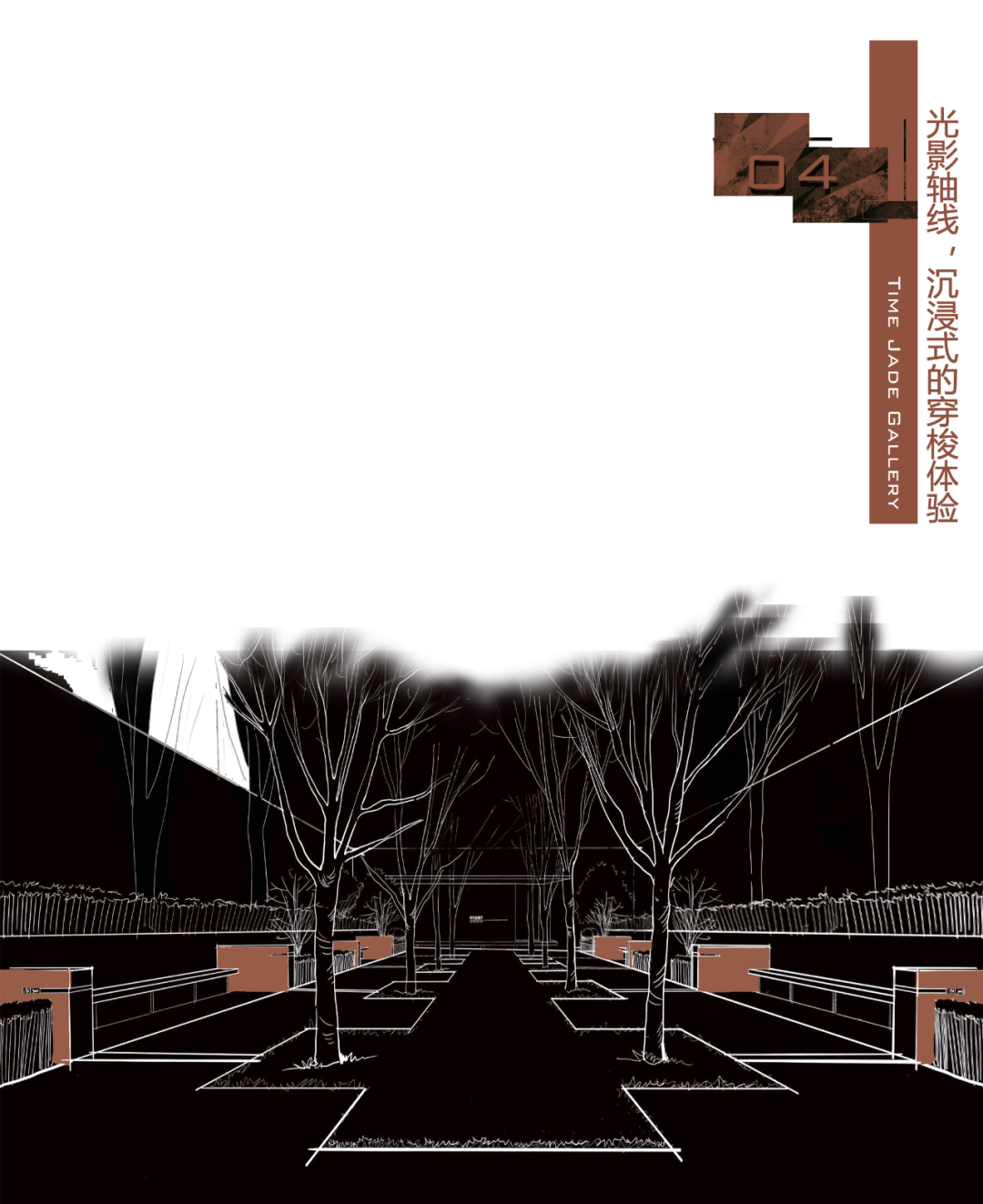 结合未来大区轴线考虑,在场地中置入工业时代的铁轨元素,进行现代化、艺术化处理,强化未来礼序归家动线,打造时光翠廊轴线空间。对称小廊,红砖作陪,绿植做衬,既是开场空间的延续,又可享受独自的静谧时光。