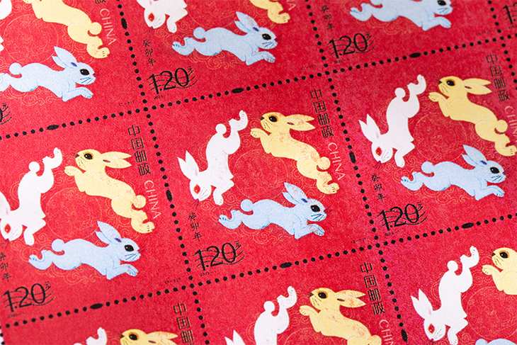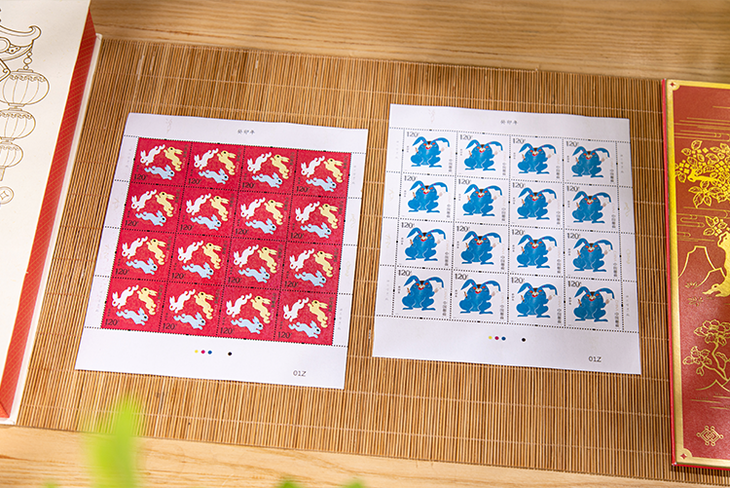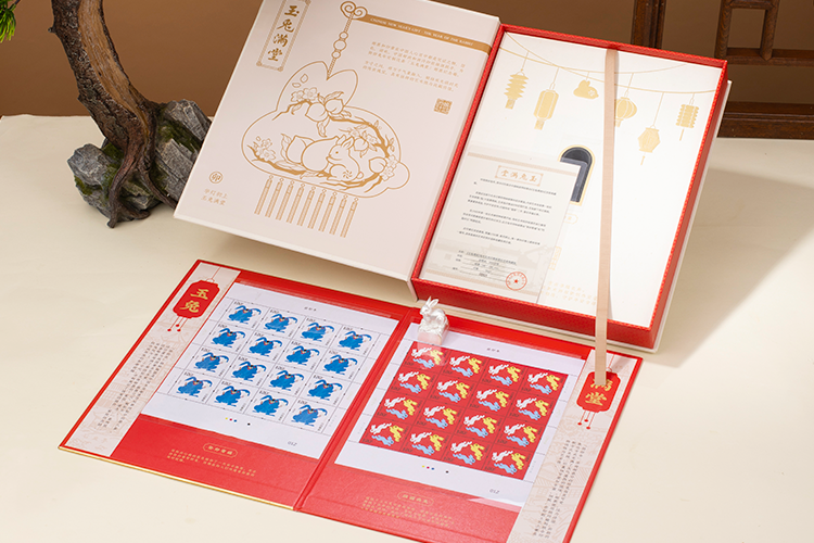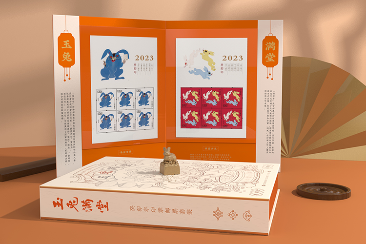 邮票册封面,屋檐前玉兔们或抬头望月,或双爪抓“钱”、或交头接耳,犹如满堂玉兔闹新春,热热闹闹过大年。