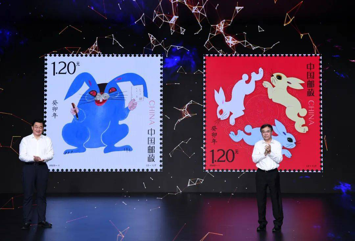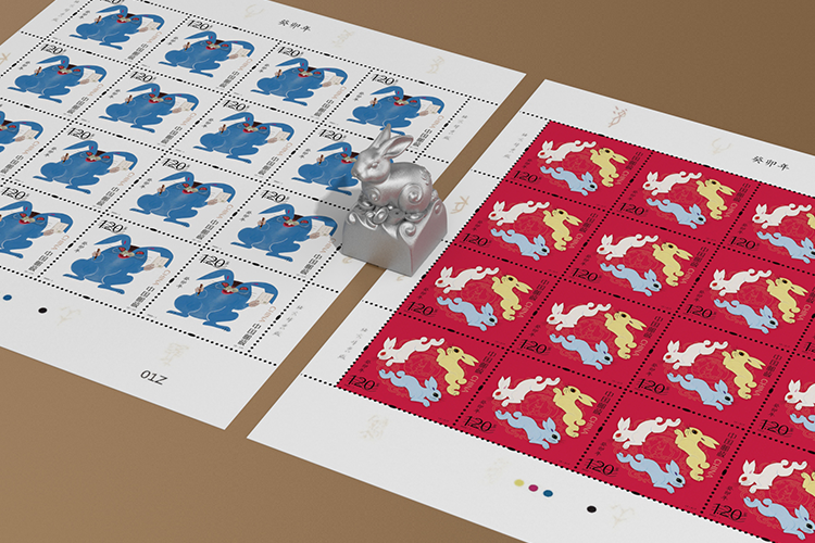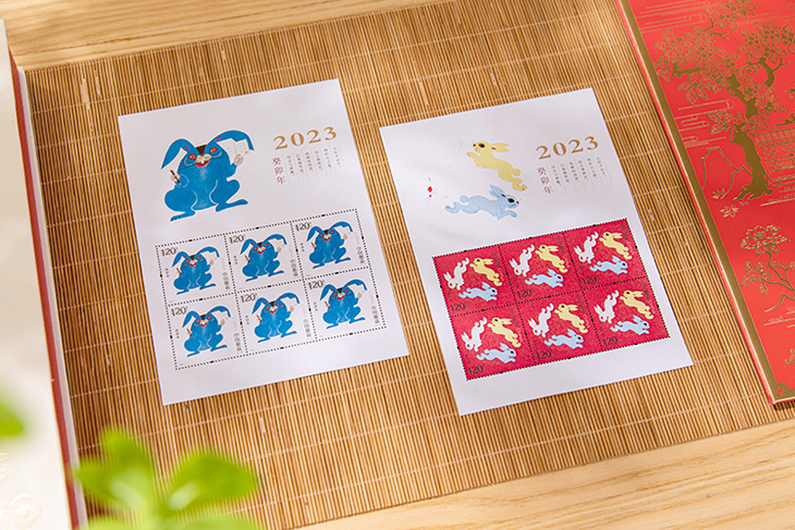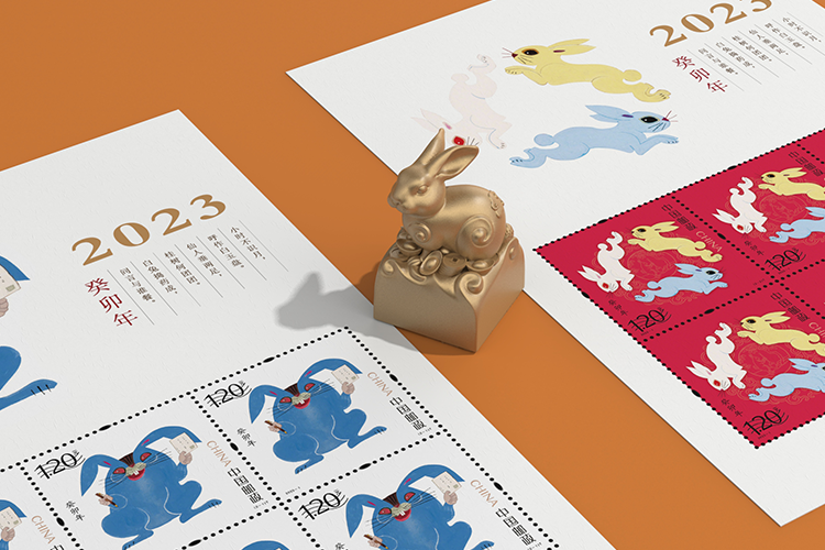 第一枚名为“癸卯寄福”。用别出心裁的蓝色,描绘了一只右手执笔、左手持信的睿智卯兔。