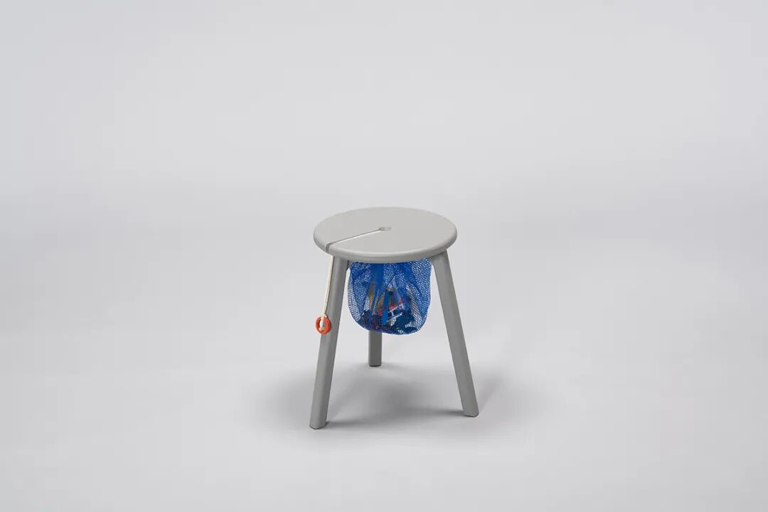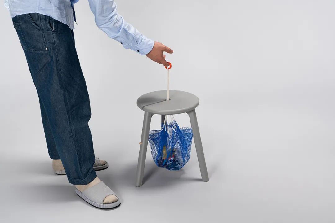渔民在海边用渔网捕鱼,就好像你在家里用袋子‘捕获’各种杂物。这是一个具有收纳功能的凳子,中间有像渔网一样的收纳袋。放下去时,袋子打开,各种‘鱼儿’(杂物)入袋。当提起来圆环时,大网收起,猎物全部收入网中。