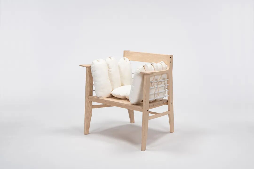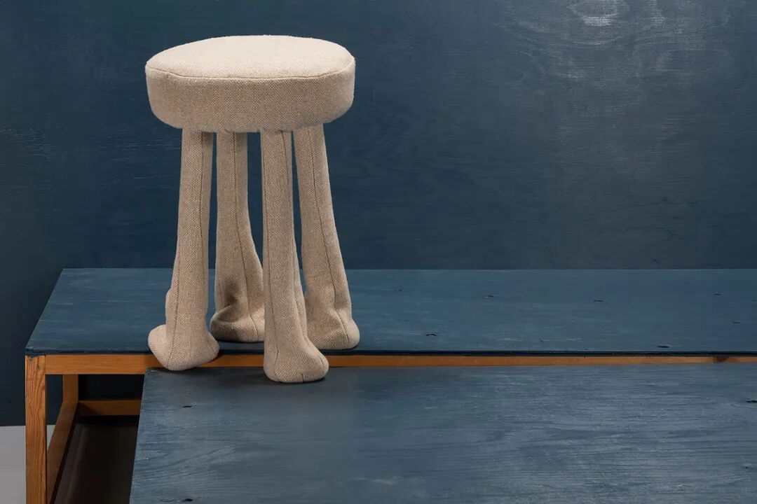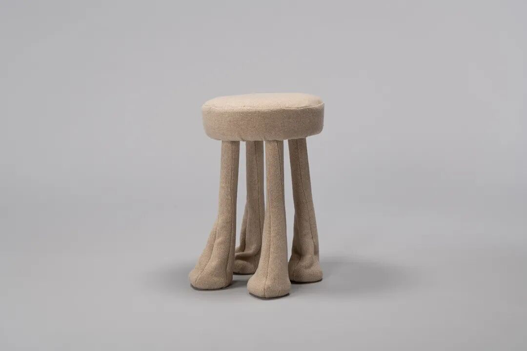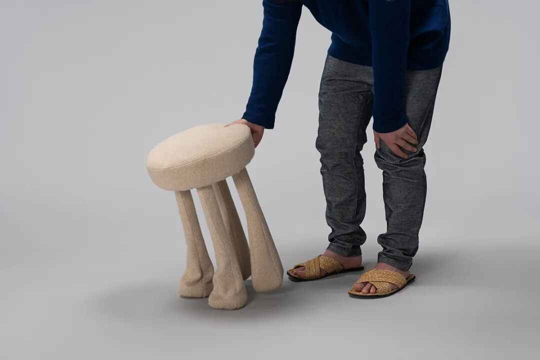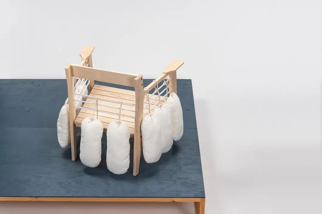 立在沙滩上的沙柱,形态各异,以一种暂时的稳定状态而存在着。我想去模拟这种状态,凳子用布包裹着,在腿的部分就如同袋子一般,里面装着沙子。每一次抬起凳子,又放下凳子,你筑起的沙柱的形态都不一样。