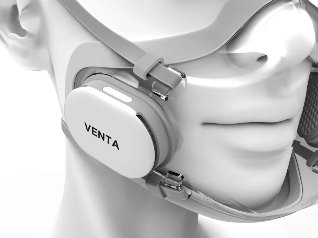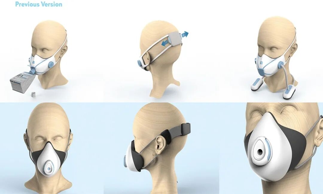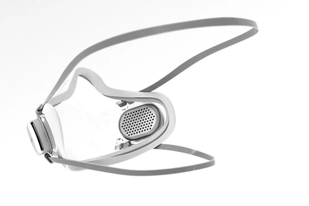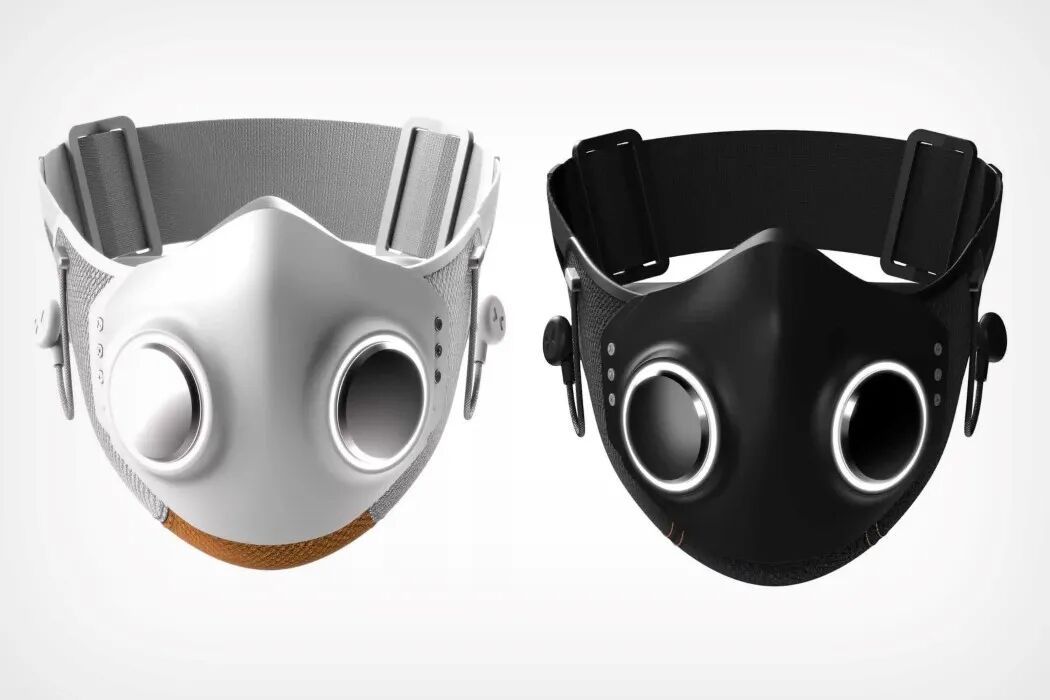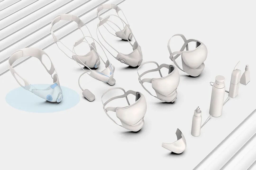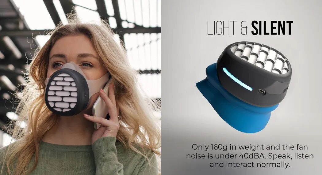 这是一款自带风扇的N95口罩,内部设计有风扇,三档设置让空气更加流通。每个面罩内部都配有UV-C灯,不戴时可以对口罩进行消毒。