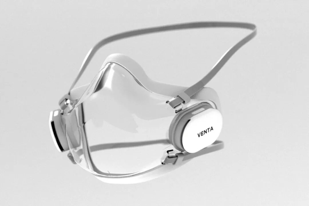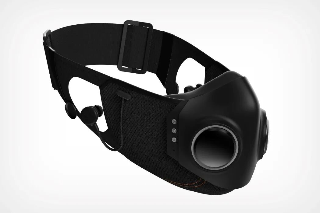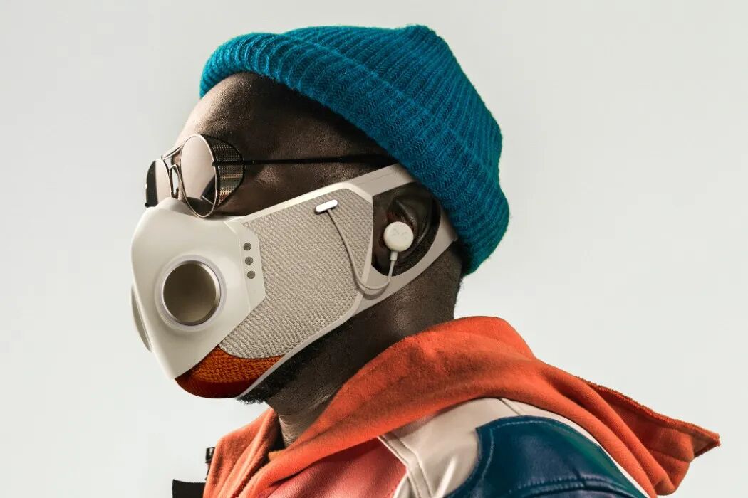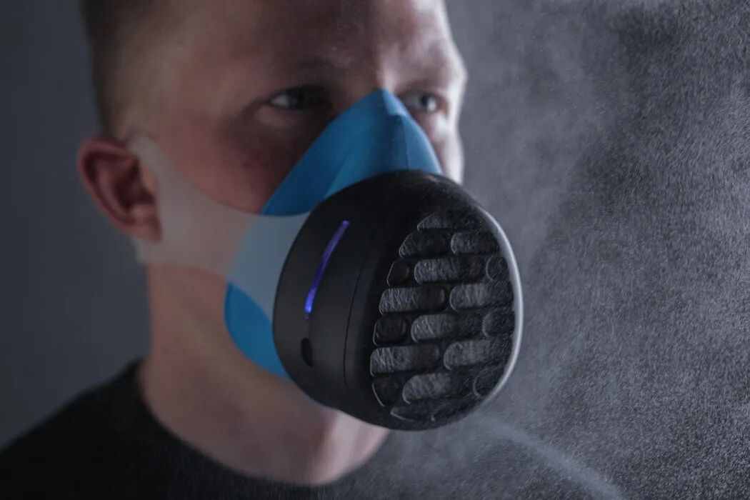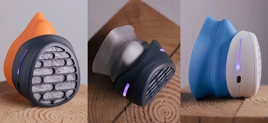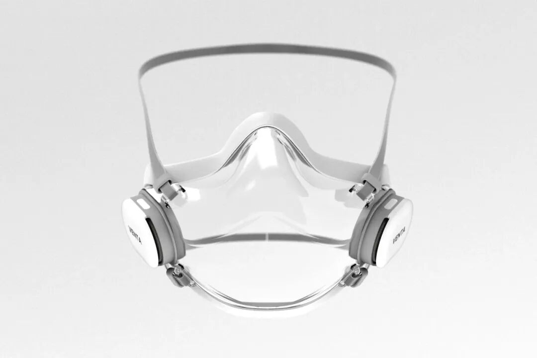 这是一款自带风扇的N95口罩,内部设计有风扇,三档设置让空气更加流通。每个面罩内部都配有UV-C灯,不戴时可以对口罩进行消毒。