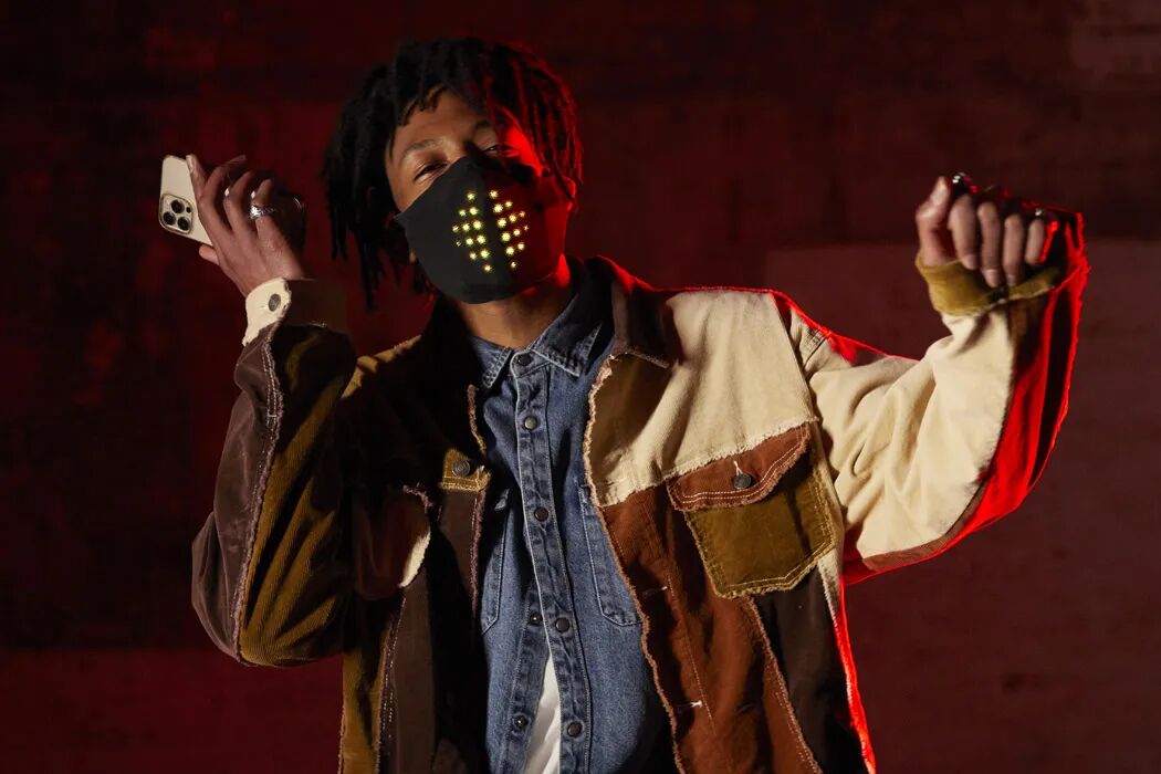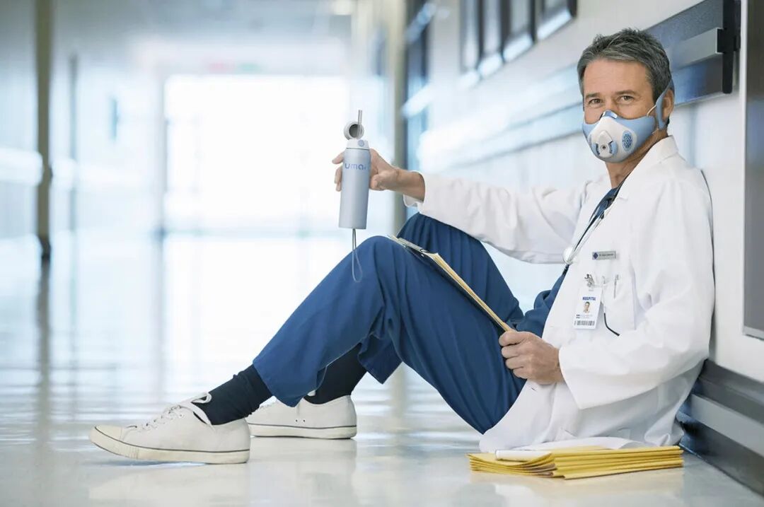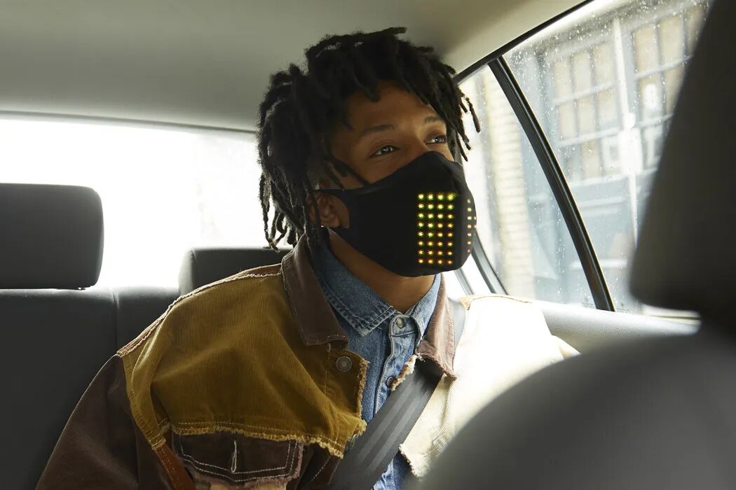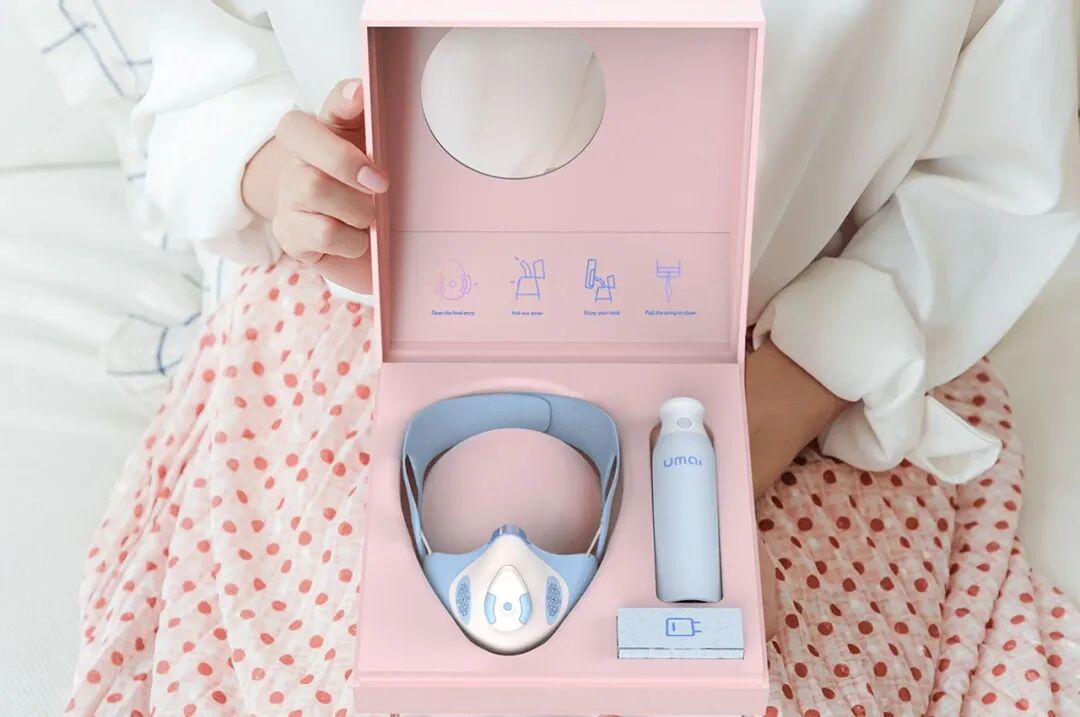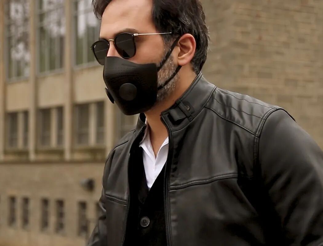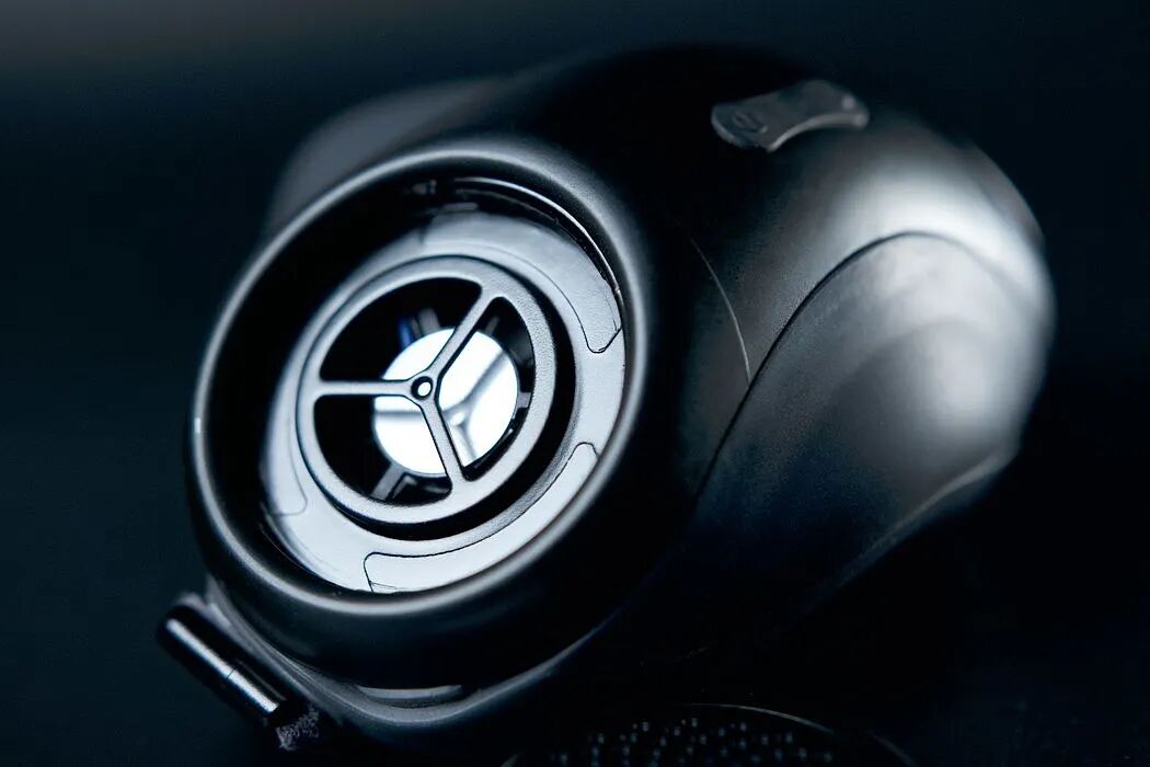 这是一款自带风扇的N95口罩,内部设计有风扇,三档设置让空气更加流通。每个面罩内部都配有UV-C灯,不戴时可以对口罩进行消毒。